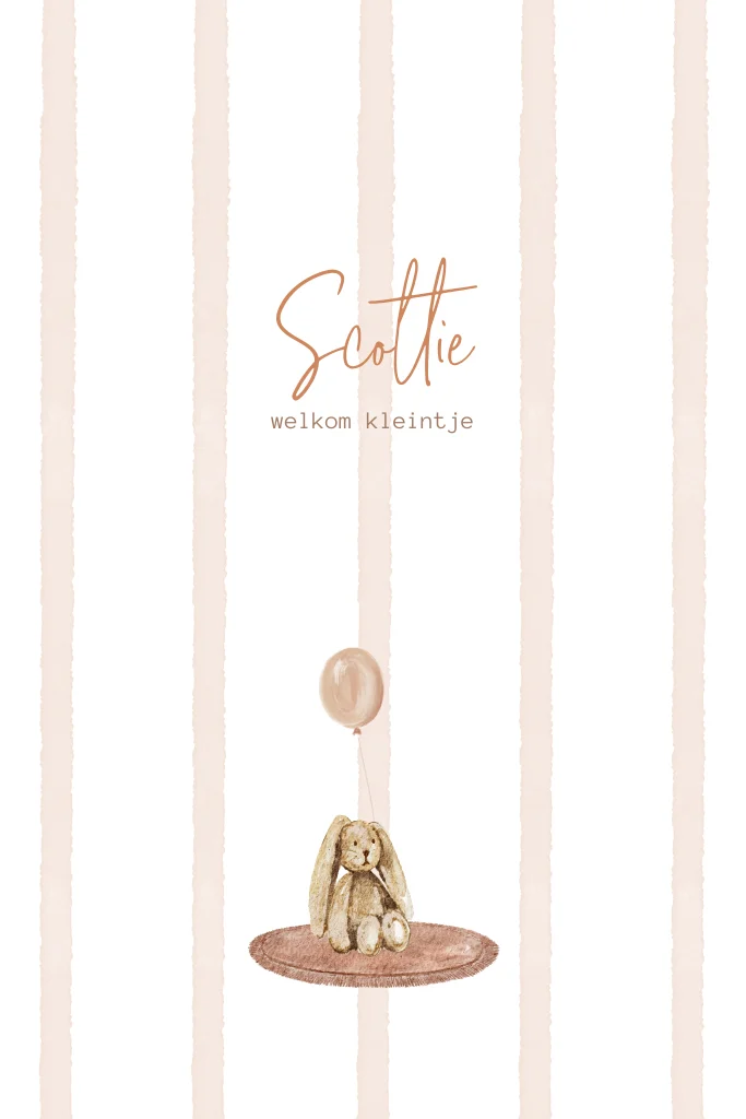 Lief en klassiek geboortekaartje voor een meisje. De achtergrond heeft zachtroze strepen en daarop staat de naam van jullie dochter in een donkere brique kleur. Onderaan het kaartje staat een illustratie van een knuffel met een roze ballon. Je kunt alle kleuren eenvoudig aanpassen in onze editor.