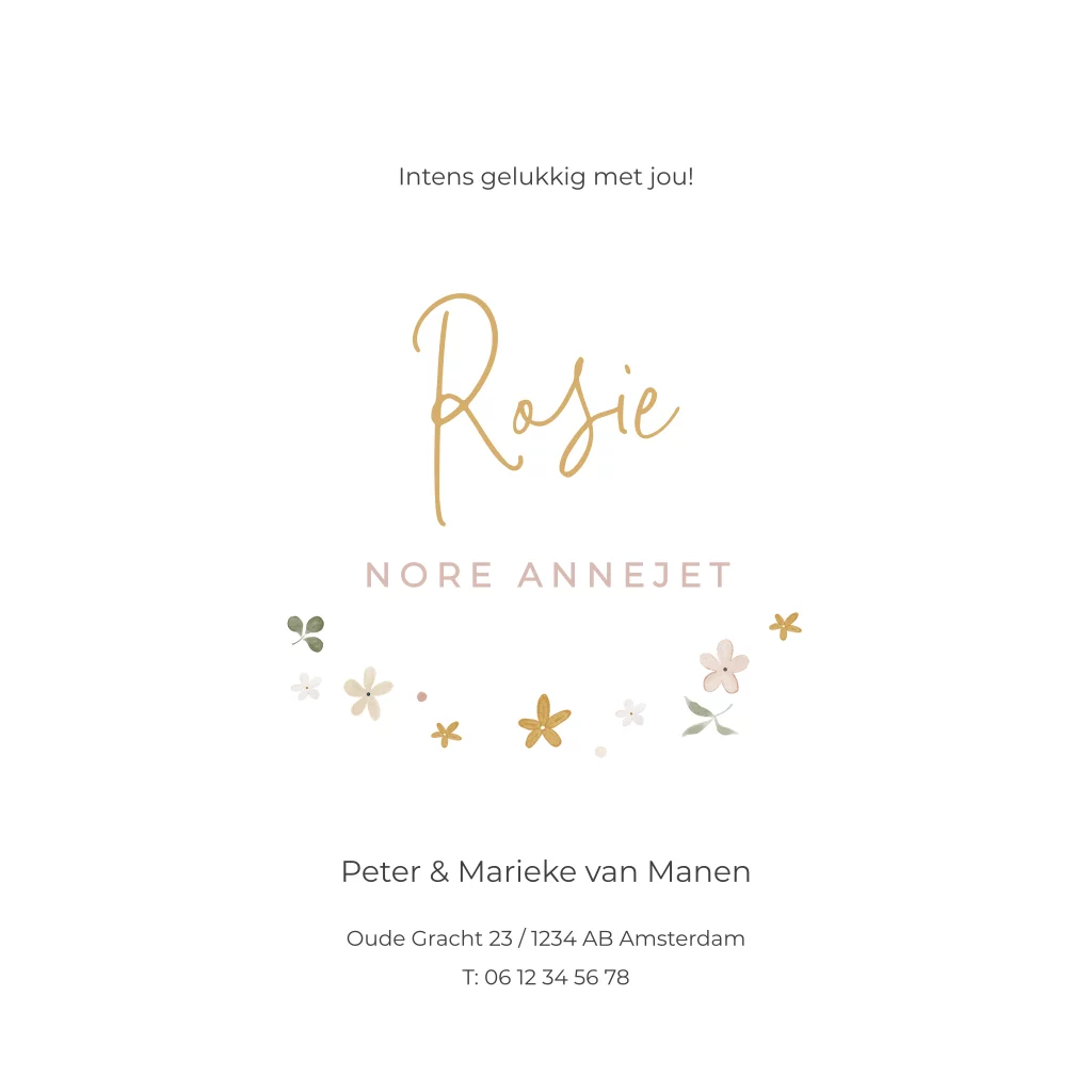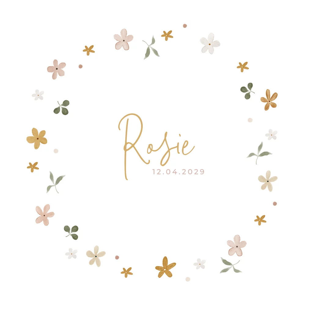 Geboortekaartje met een bloemenkrans in zachte tinten. Dit kaartje heeft bloemetjes in roze, gele en groene kleuren. Lief kaartje voor een pasgeboren dochter.
