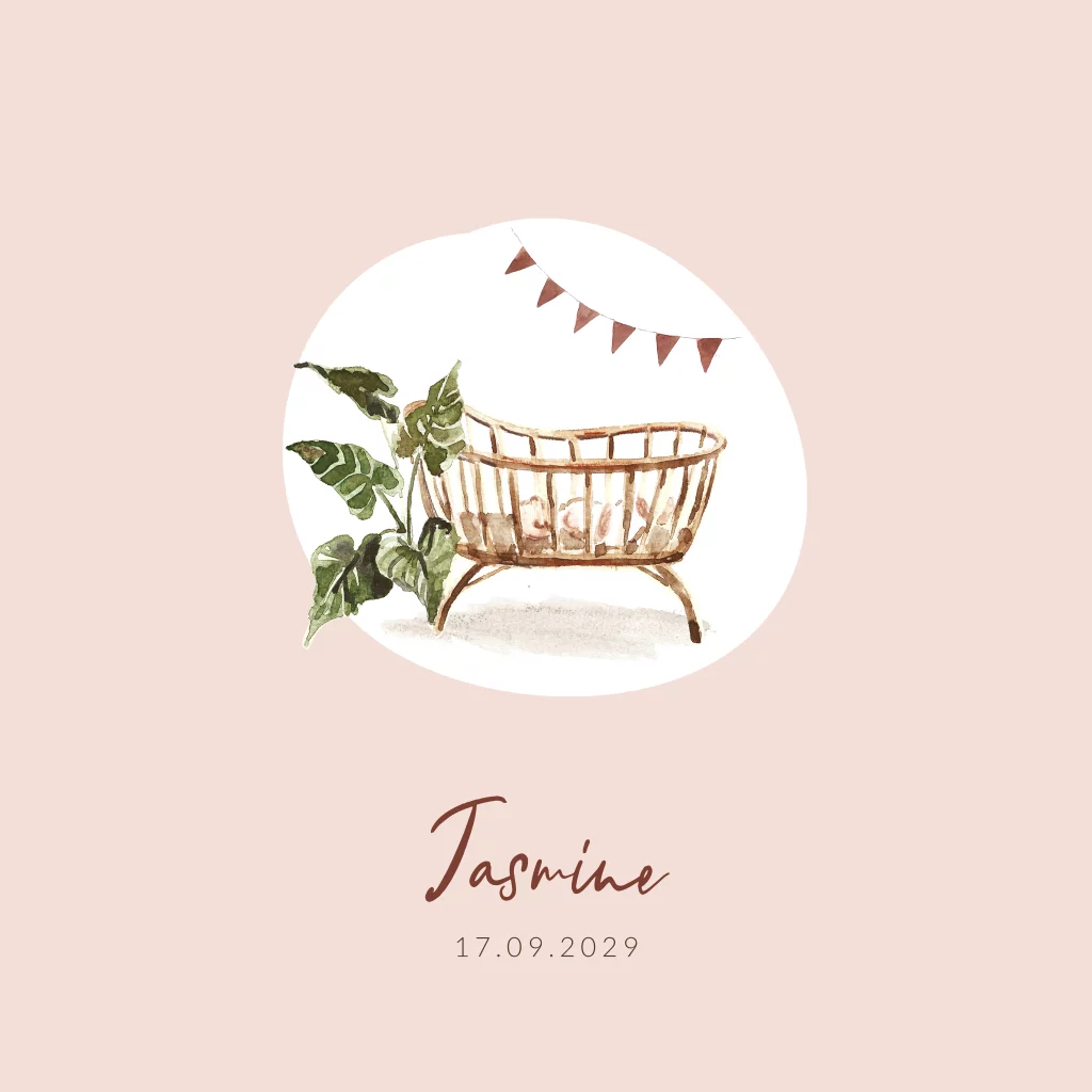 Dit enkele geboortekaartje is zo lief. De illustratie van het rotan wiegje is mooi getekend en bij de wieg staat een groene kamerplant. Bovenaan staat een vrolijke vlaggen lijn. De tekeningen staan los op het kaartje en kan je zelf heel makkelijk aanpassen.