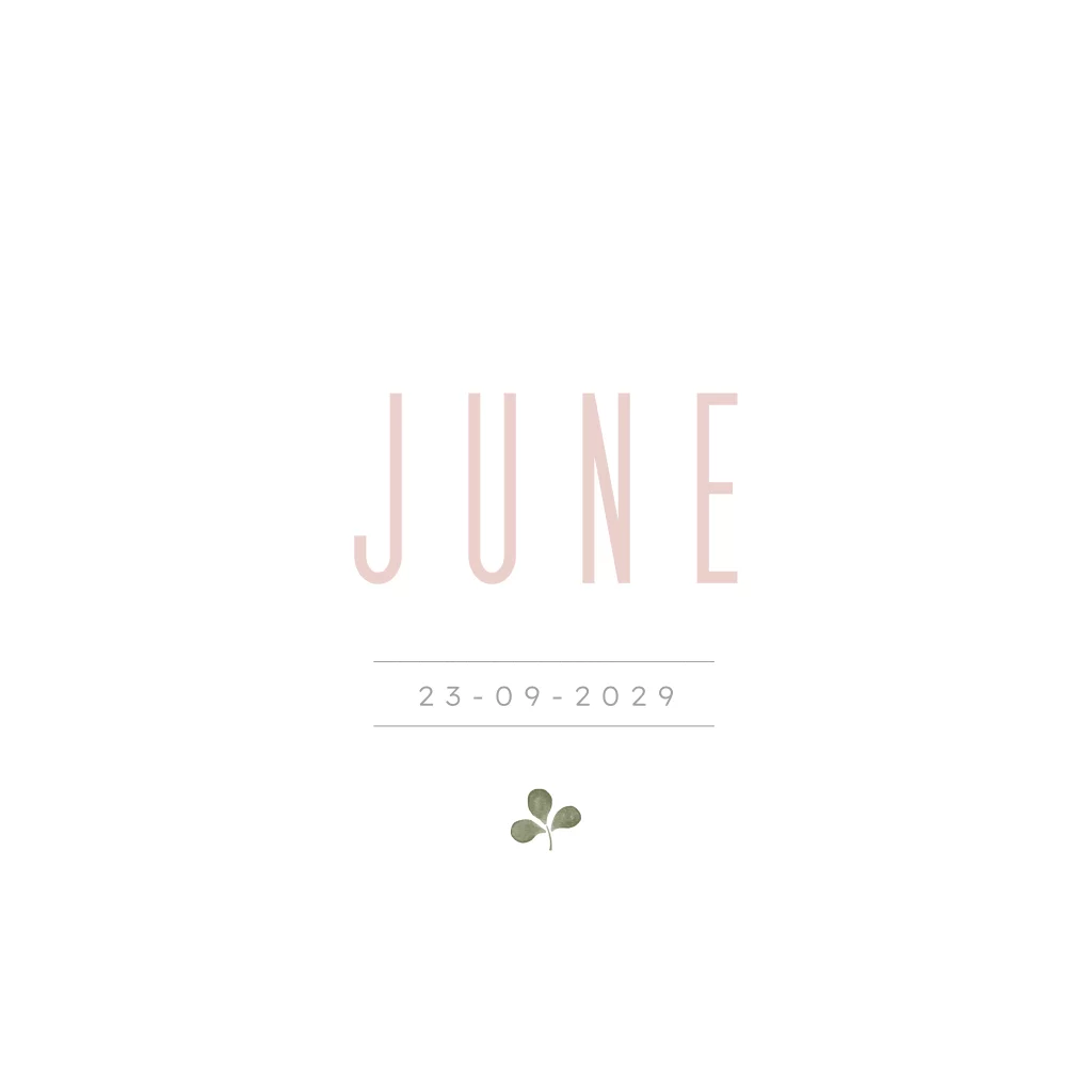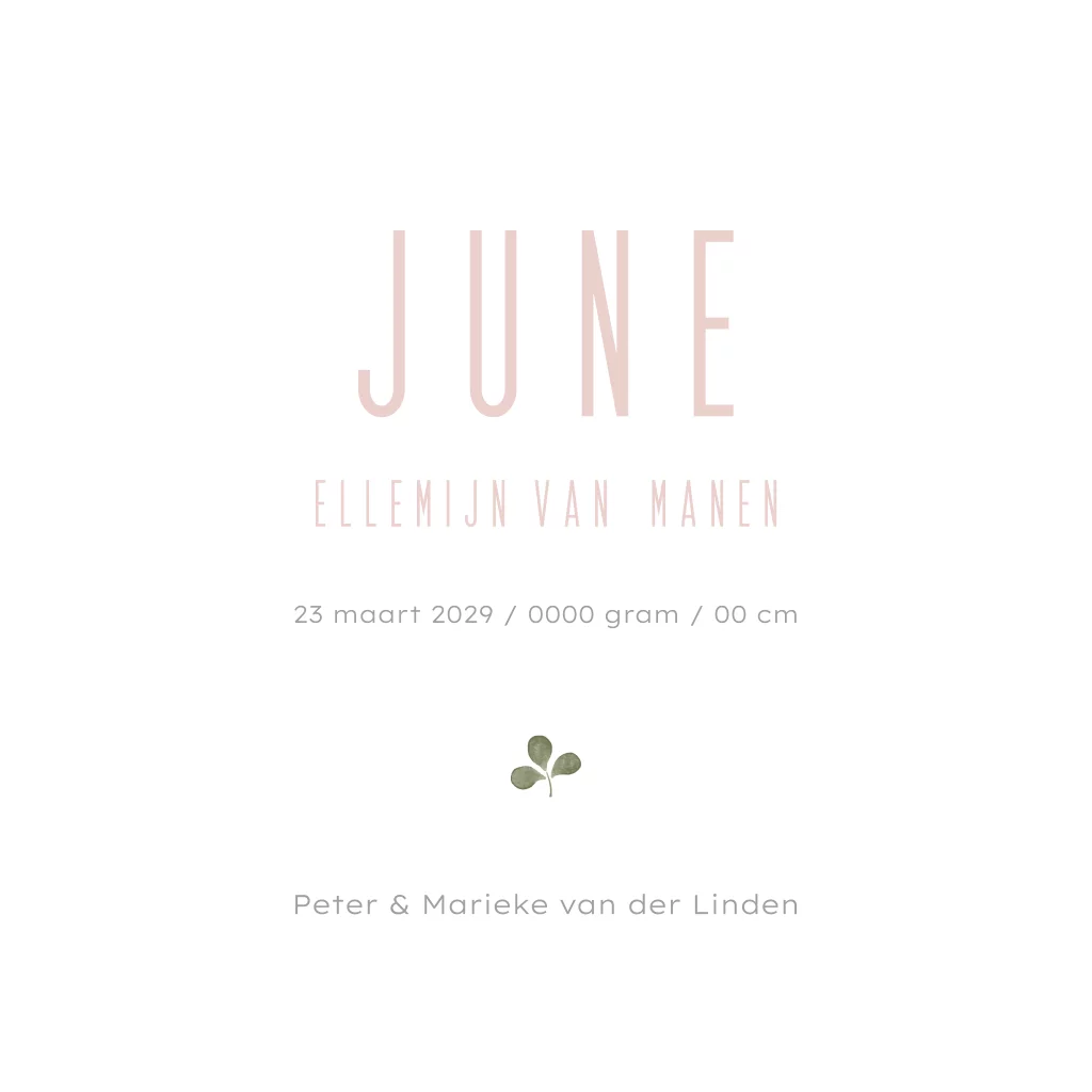 Lief minimalistisch geboortekaartje voor een meisje met de naam in roze. Onder de naam staat een groen takje met drie blaadjes. Dit kaartje voor een dochter kan je zelf aanpassen in onze editor.