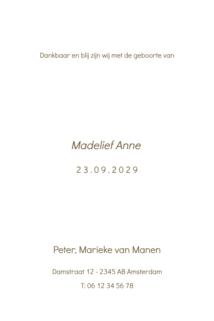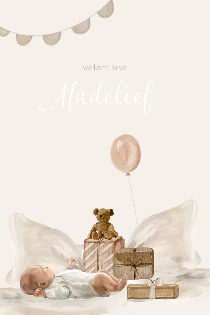 Wat een prachtig en uniek geboortekaartje is dit. een baby ligt tussen de cadeautjes en een teddybeer. De achtergrond is creme en de naam wordt gedrukt in rosefolie. Dit kaartje kan je helemaal zelf bewerken en aanpassen.