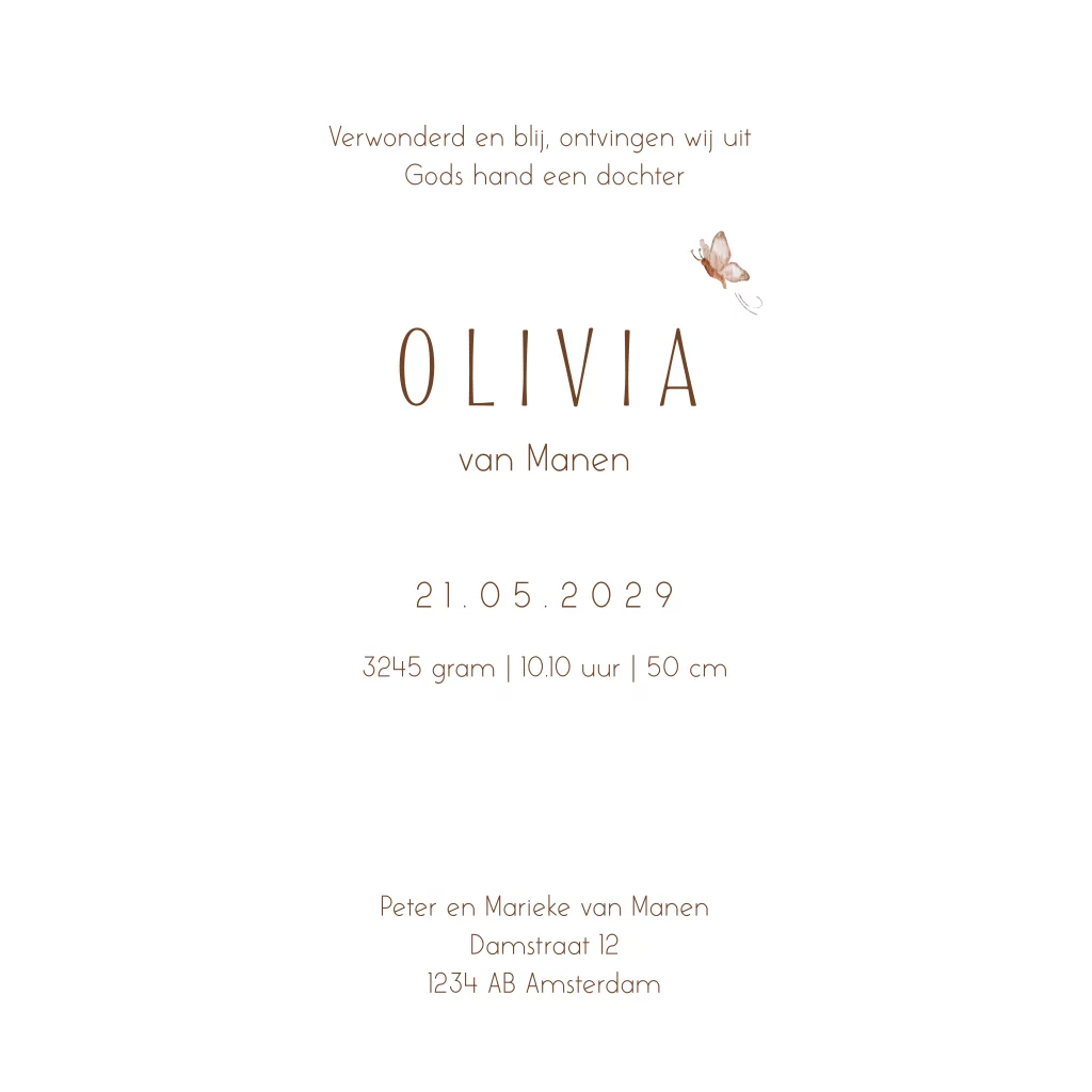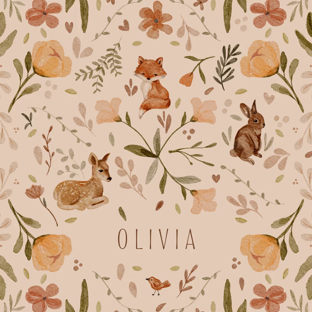 Vierkant geboortekaartje met een roze achtergrond en bosdieren patroon