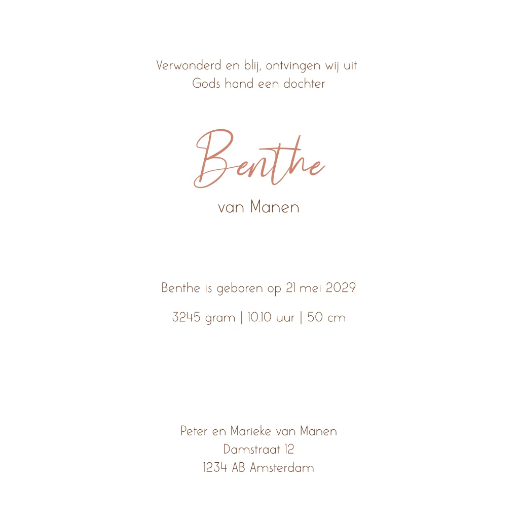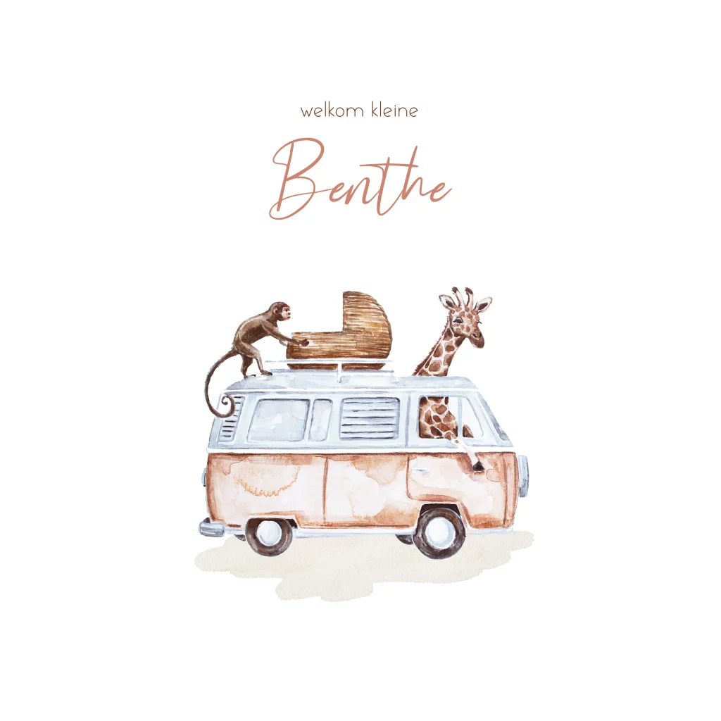 Zomer geboortekaartje voor een meisje met een volkswagenbus en jungledieren zoals een giraffe en een aap. Op de bus staat een mandje met een baby. Prachtig getekend geboortekaartje voor een meisje.