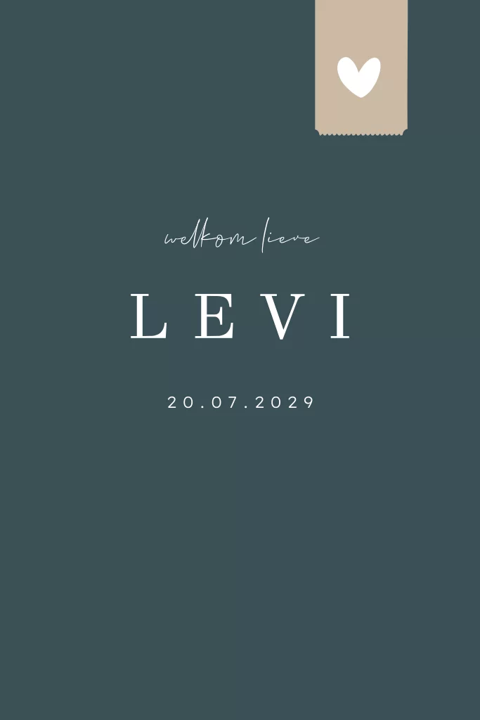 Groen stoer geboortekaartje jongen met een bruin label met hartje