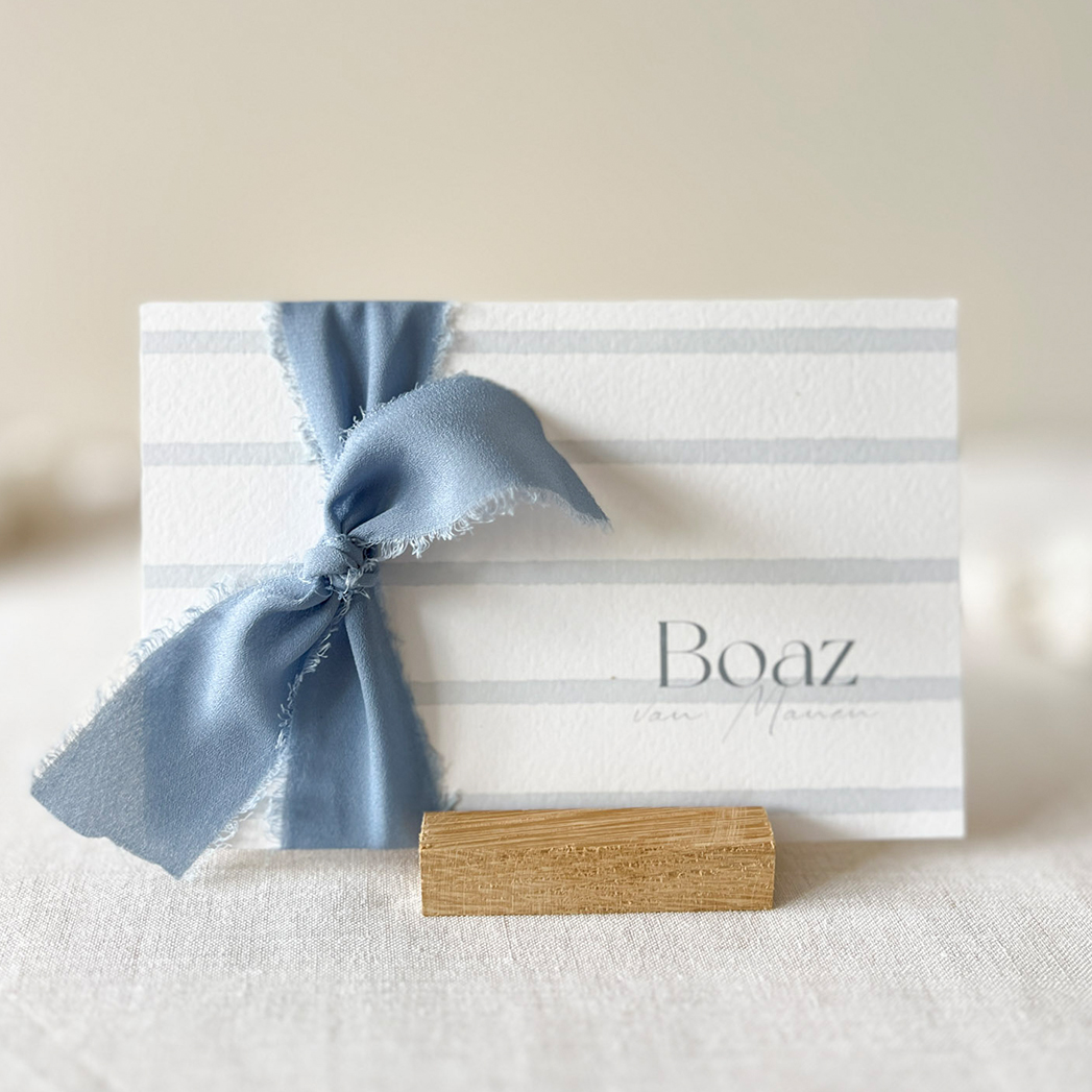 Klassiek geboortekaartje met blauwe strepen. De strepen hebben een waterverf effect en kan je zelf ook aanpassen in kleur. Dit christelijke geboortekaartje is al stijlvol maar voeg er een mooie blauwe strik aan toe voor een extra chique effect.
