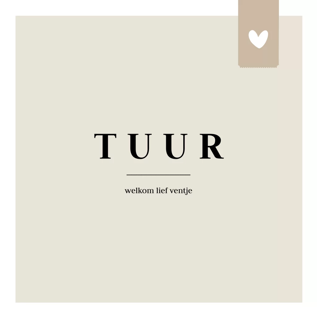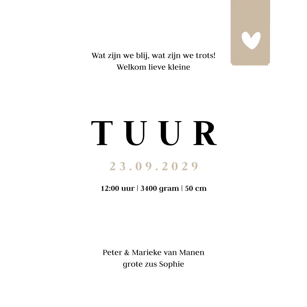Klassiek geboortekaartje voor een zoon in een creme kleur met een witte rand eromheen. Aan de bovenkant zit een bruin labeltje met een wit hartje.