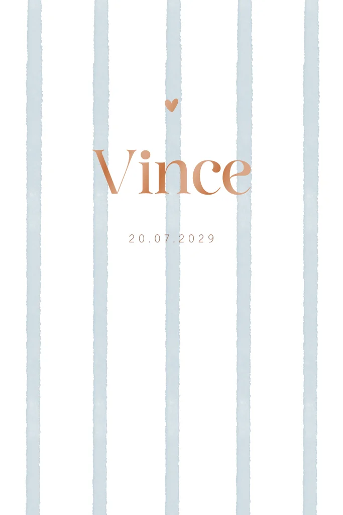 Lief minimalistisch geboortekaartje voor een jongen. De achtergrond heeft lichtblauwe strepen en daarop staat de naam van jullie zoon in een bronzen hoogglans kleur. Je kunt alle kleuren eenvoudig aanpassen in onze editor.