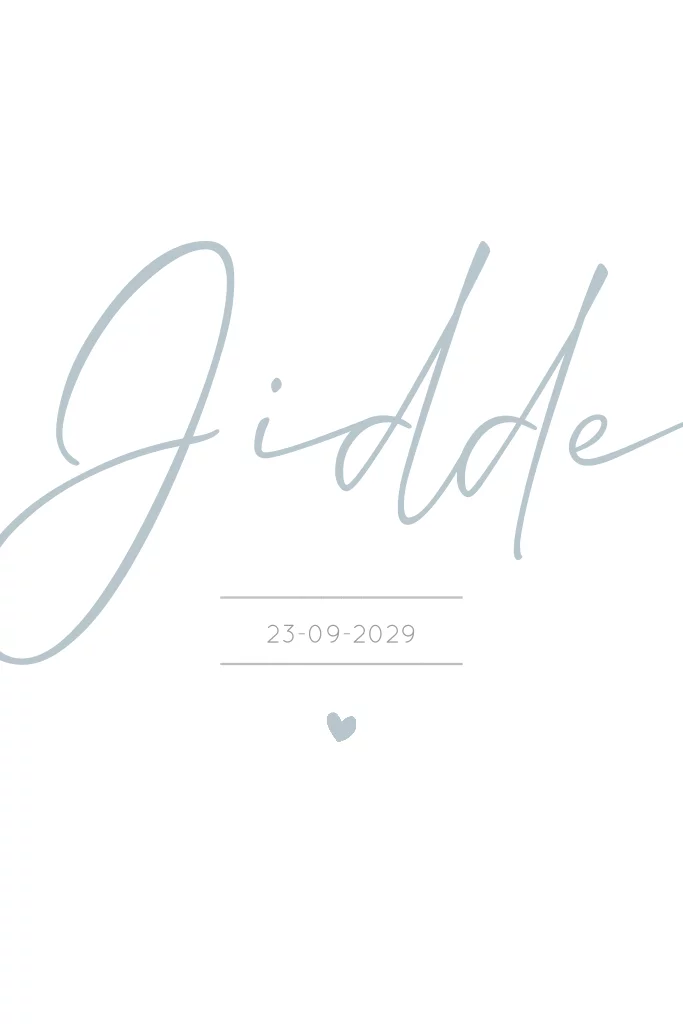 Trendy geboortekaartje voor een klein ventje. De achtergrond is wit en de naam van het kindje staat in een jeansblauwe kleur. Het handgeschreven lettertype geeft de kaart net wat extra's.