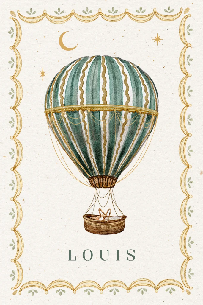 Geboortekaartjes met luchtballonnen zijn dé trend van nu! Dit kaartje heeft een mooie groene luchtballon in combinatie met goudgeel. Een maantje en sterretjes staan in de lucht en het kaartje heeft een getekende border. Uniek kaartje voor een zoontje.