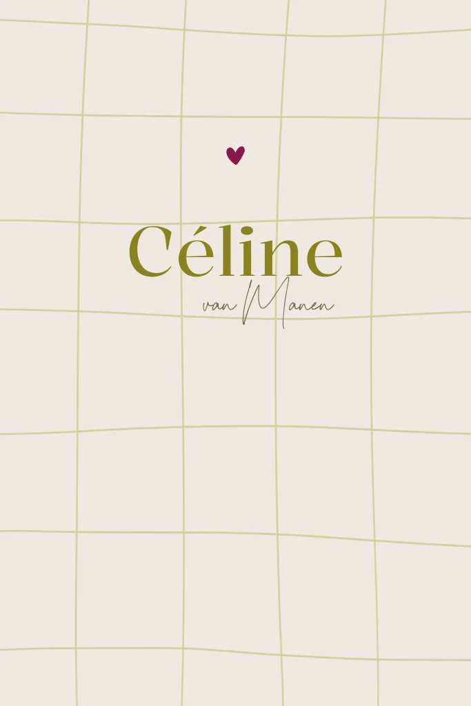 Een hip geboortekaartje voor een klein meisje. Het kaartje heeft een grafisch handgetekend ruitjes patroon. De achtergrond van het kaartje is beige en de ruitjes zijn groen. Boven de naam staat nog een aubergine hartje. Deze zijn allemaal in kleur aan te passen in onze handige editor.