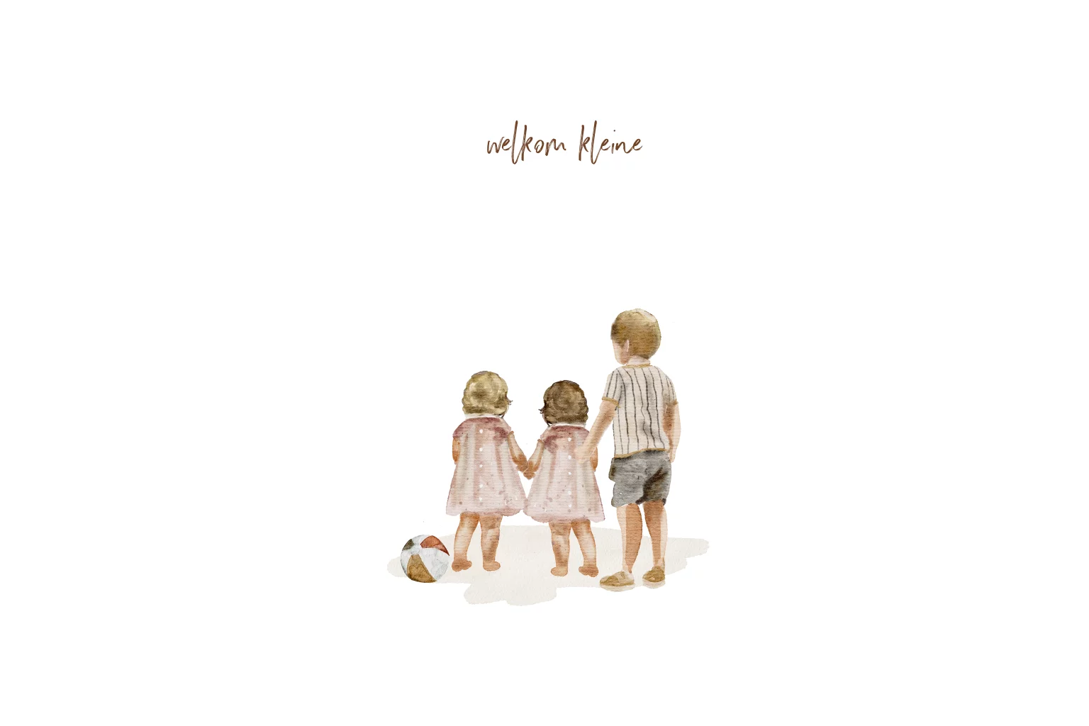 Lieve geboortekaart voor een tweeling. Op het kaartjes staan de tweeling meisjes in roze jurkjes en daarbij staat nog een grote broer. De kindjes zijn te vervangen voor een eigen gezinssamenstelling. Uniek getekend kaartje voor jullie twins met roséfolie namen.