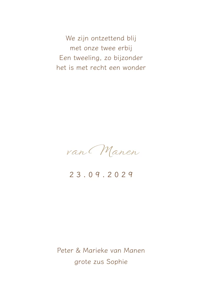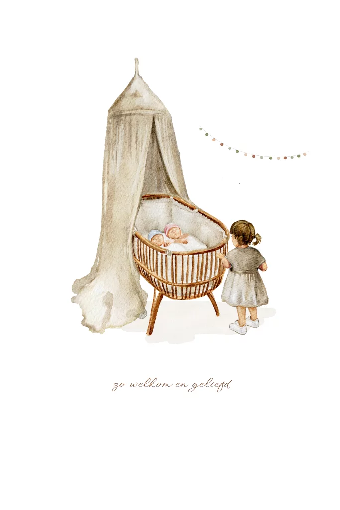 Lief geboortekaartje voor een tweeling. In een mooie getekende wieg liggen twee babytjes, eentje met een roze mutsje en eentje met een blauw mutsje. Naast de wieg staat een oudere zus te kijken in de wieg. De namen staan in goudfolie. Je kunt die kaartje zelf bewerken en aanpassen.