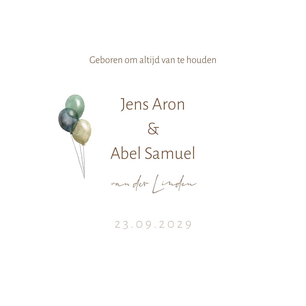 Geboortekaartje met giraffen op een bakfiets. In de bak zit de mama giraffe en daarbij een grote broer of zus met een tweeling. De ballonnen kan je vervangen door andere kleuren als het meisjes zijn.