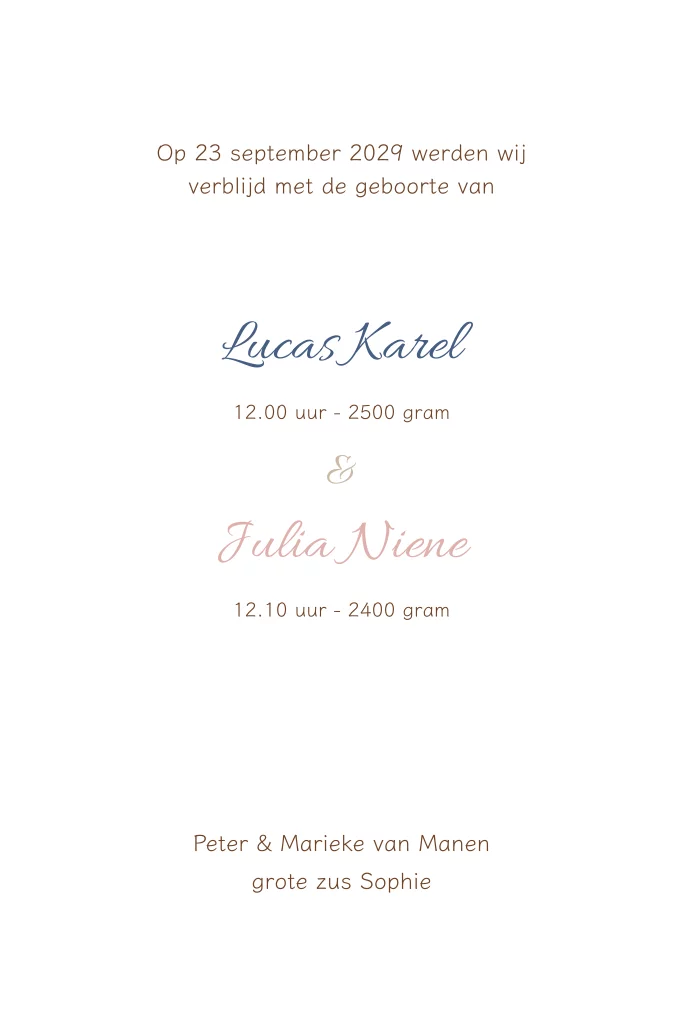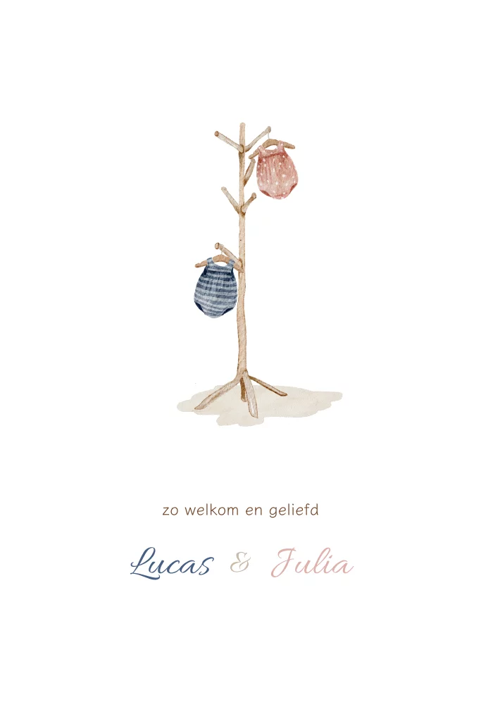 Uniek getekend geboortekaartje voor een tweeling met een kapstok. Hieraan hangen 2 rompertjes in een roze en een blauwe kleur. Je kunt dit tweelingkaartje zelf bewerken en aanpassen.