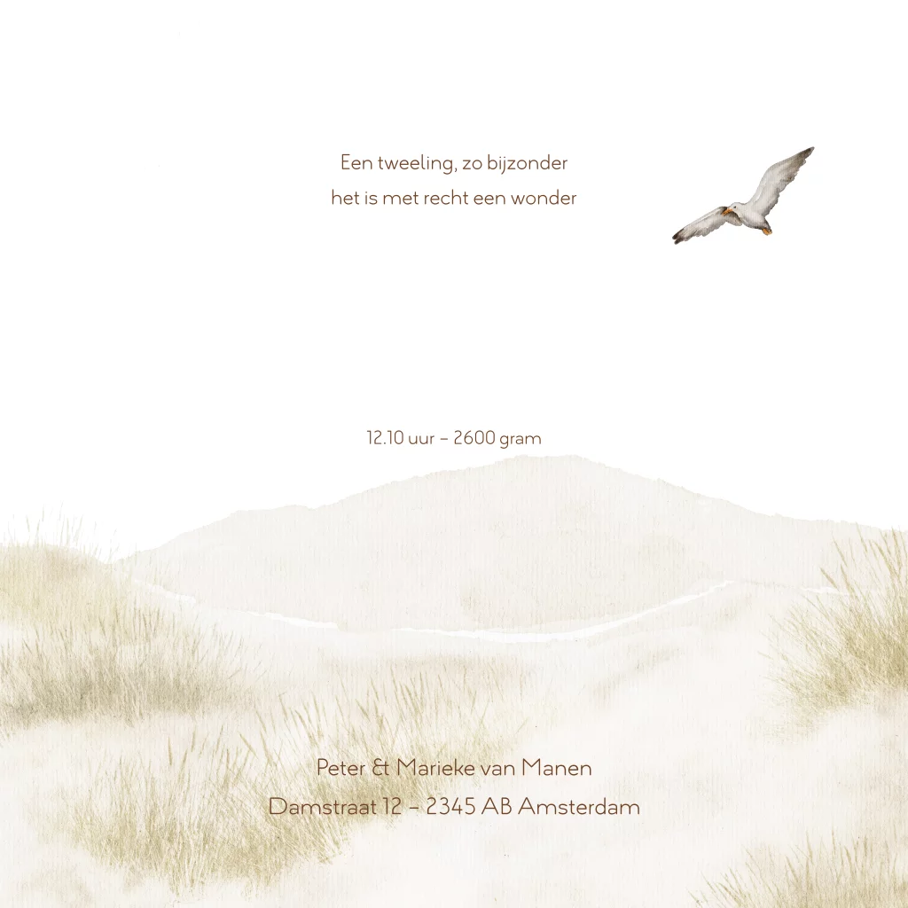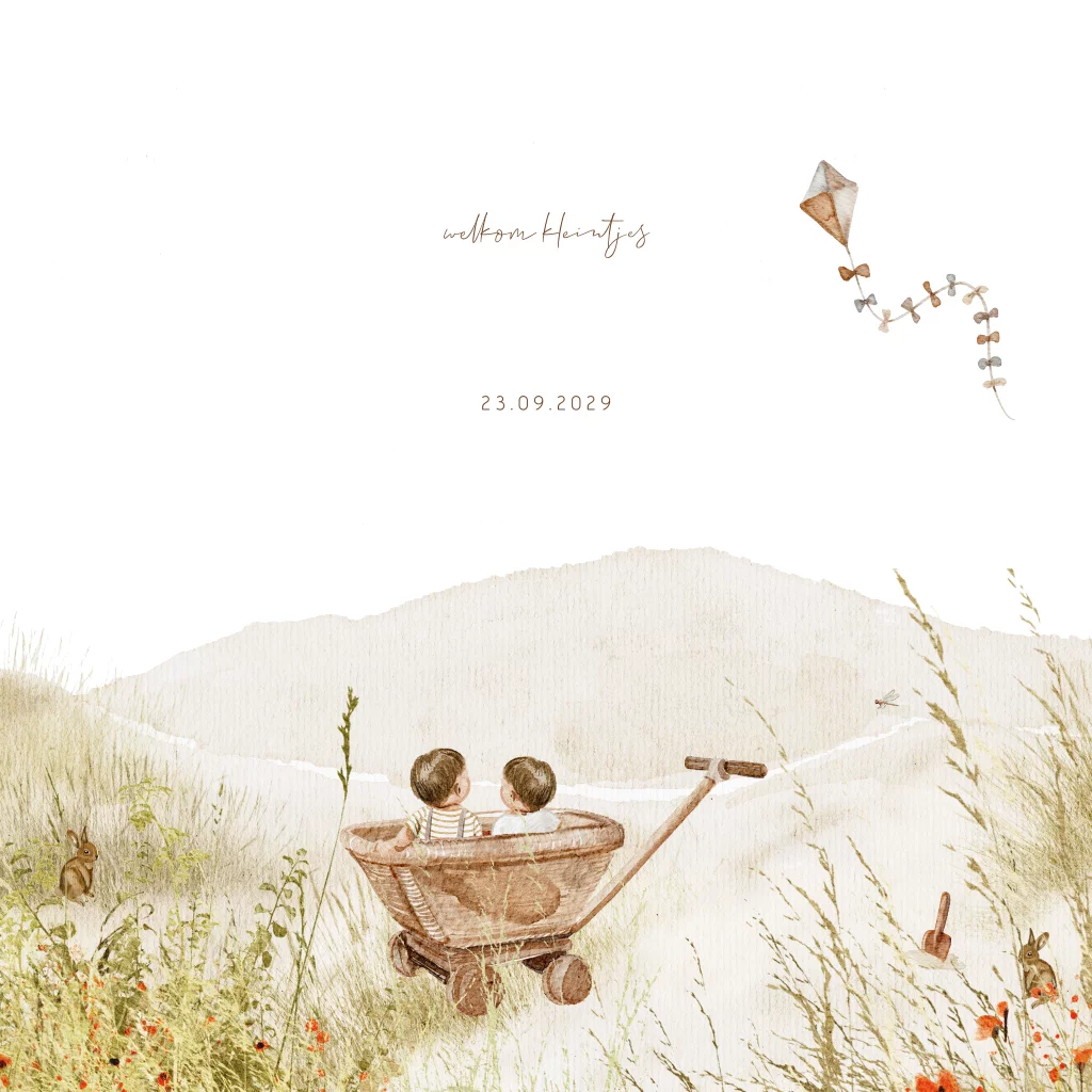 Lief getekend geboortekaartje voor een jongens tweeling. De achtergrond bevat duinen en strand en in het zand staat een bolderkar. In de kar zit een tweeling, twee kleine baby jongens. Dit prachtige aquarel babykaartje kan je zelf bewerken en naar wens aanpassen. De namen worden gedrukt in glanzend goudfolie.