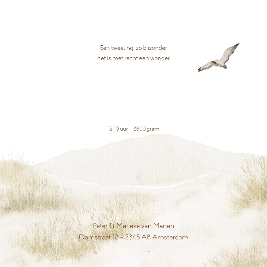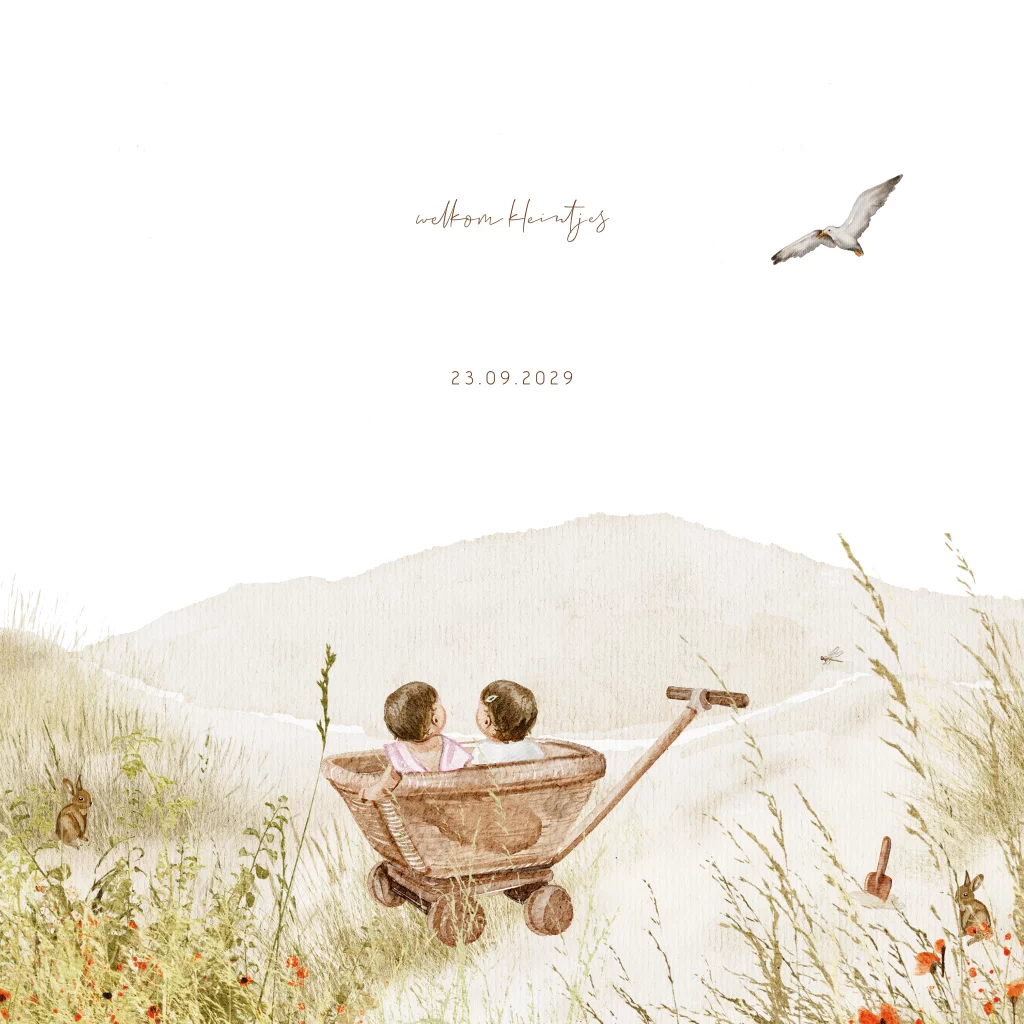 Lief getekend geboortekaartje voor een meisjes tweeling. De achtergrond bevat duinen en strand en in het zand staat een bolderkar. In de kar zit een tweeling, een twee kleine baby meisjes. Dit prachtige aquarel babykaartje kan je zelf bewerken en naar wens aanpassen. De namen worden gedrukt in glanzend goudfolie.