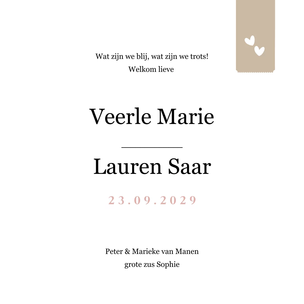 Klassiek geboortekaartje voor een tweeling. De achtergrondvlakken zijn roze, dus helemaal geschikt voor 2 dochters. Maar door het vlak aan te passen in kleur, kan je er ook een jongen tweelingkaartje van maken.