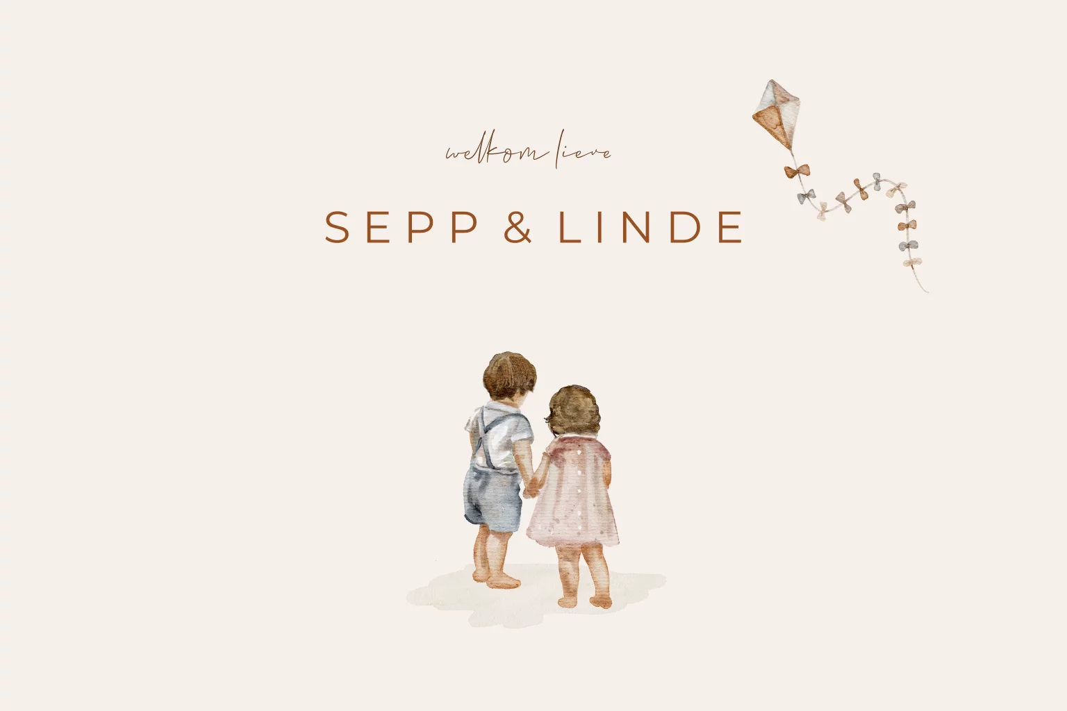 Dit geboortekaartje voor jullie tweeling is zo vertederend en schattig. Op het kaartje staat een jongetje en een meisje hand in hand. Het jongetje heeft een broekje met bretels en het meisje een lief roze jurkje. In de lucht zie je een vlieger. De ronde hoeken maken het kaartje af.