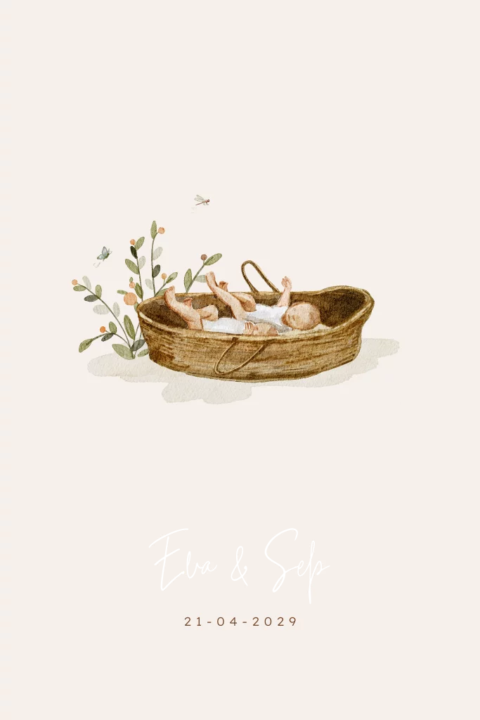 Uniek getekend geboortekaartje voor een tweeling. Op het kaartje staat een illustratie van een mandje met daarin 2 baby's. Dit tweeling kaartje kan je zelf bewerken en eventueel aanvullen met andere illustraties uit onze beeldbank. De namen worden gedrukt in goudfolie.