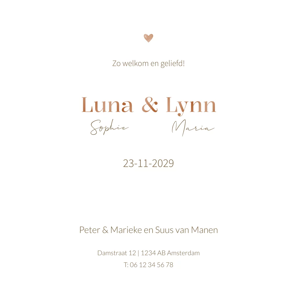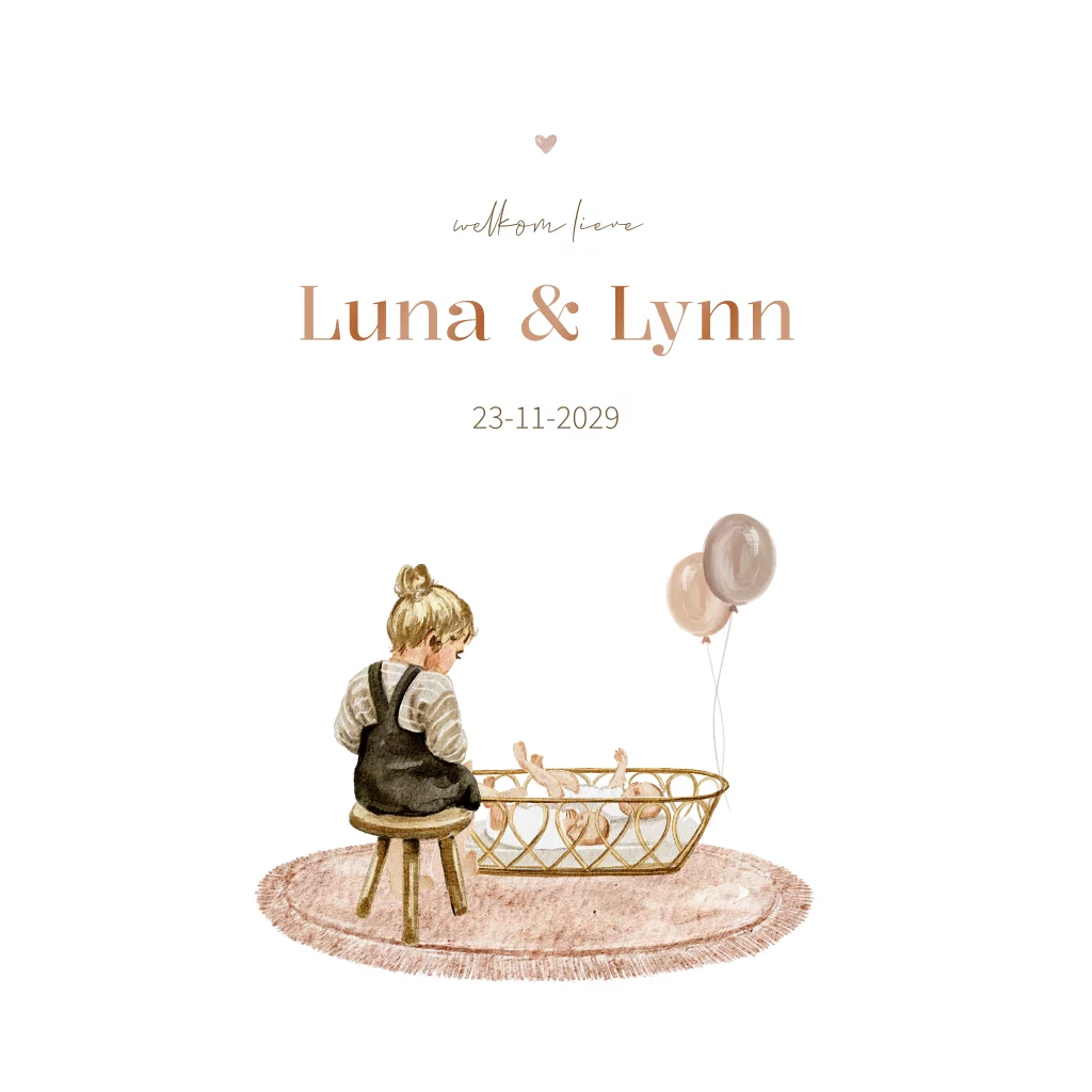 De geboorte van een tweeling is een bijzondere gebeurtenis en vraagt om een speciaal geboortekaartje. Dit unieke, handgetekende geboortekaartje voor tweelingen is ontworpen in een zachte aquarelstijl, met liefdevolle details zoals een wiegje en een grote zus die vol bewondering naar de kleintjes kijkt. Het kaartje straalt rust en warmte uit, ideaal voor een stijlvolle en persoonlijke geboorteaankondiging. De illustratie op dit geboortekaartje is volledig met de hand getekend en afgewerkt in subtiele, zachte aquareltinten. De aandacht voor detail, zoals de ballonnen en het vloerkleedje, maakt dit kaartje bijzonder. Of je nu op zoek bent naar een klassiek ontwerp of iets unieks voor de geboorte van je tweeling, dit geboortekaartje valt op door zijn verfijnde stijl. Bij Fientje en Co bieden we niet alleen standaard ontwerpen, maar ook de mogelijkheid om geboortekaartjes op maat te laten maken. Dit kaartje is een prachtig voorbeeld van hoe we jouw wensen kunnen omzetten in een uniek ontwerp, speciaal voor jouw tweeling. Het handgetekende ontwerp en de zachte aquarelstijl maken dit geboortekaartje een echte eyecatcher. Start de geboorte van jouw tweeling met een kaartje dat even uniek is als zijzelf.