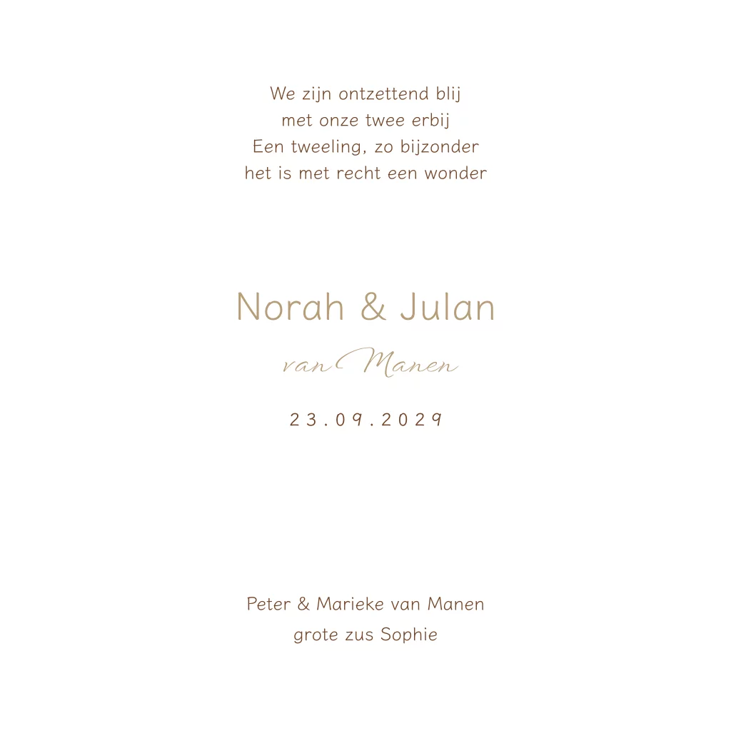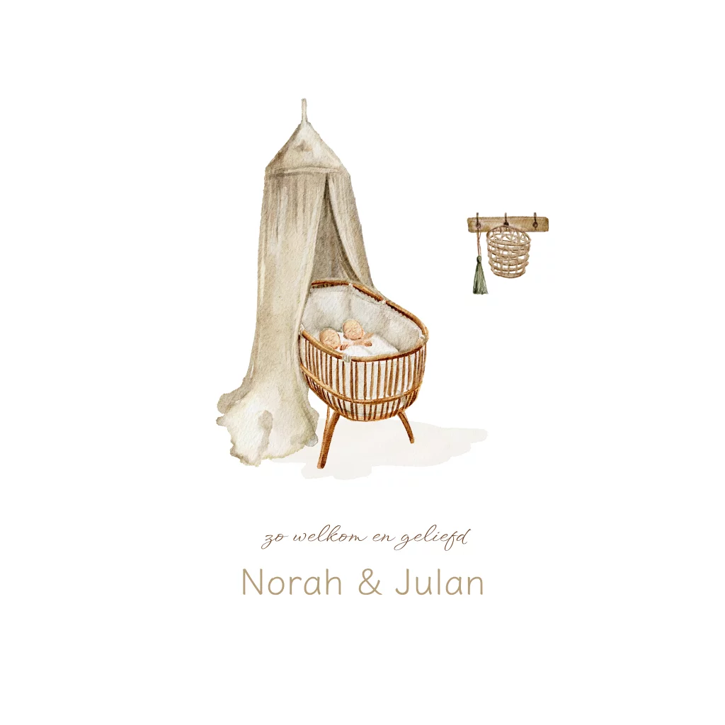 Uniek getekend geboortekaartje voor een tweeling. Op dit kaartje staat een wieg met een klamboe en daarin twee babytjes. Je kunt dit kaartje gebruiken voor twee jongens of twee meisjes en jongen en meisje.