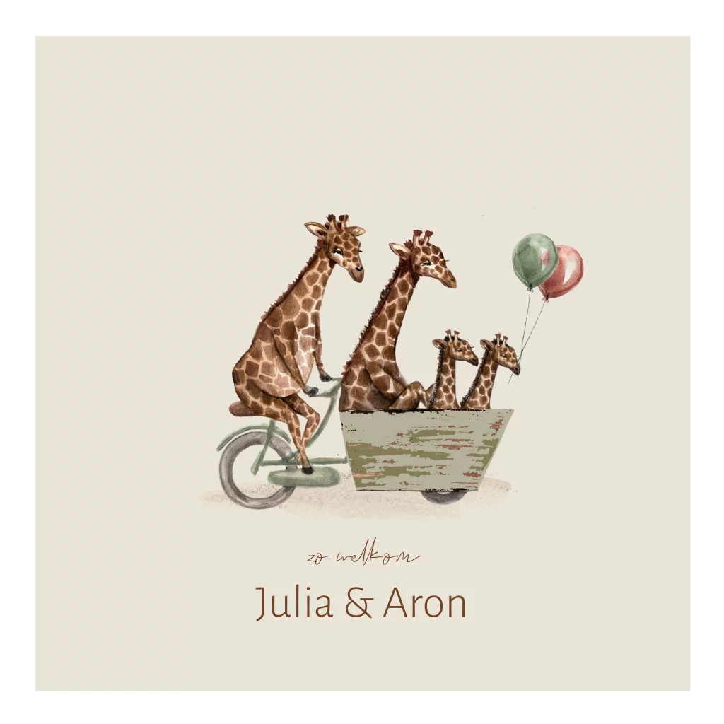 Lief tweeling geboortekaartje met giraffen. De papa fietst en de mama zit met twee kleintjes in de bakfiets. Het voorste girafje houdt een roze en groene ballon in zijn bek. De achtergrondkleur kan je zelf aanpassen.