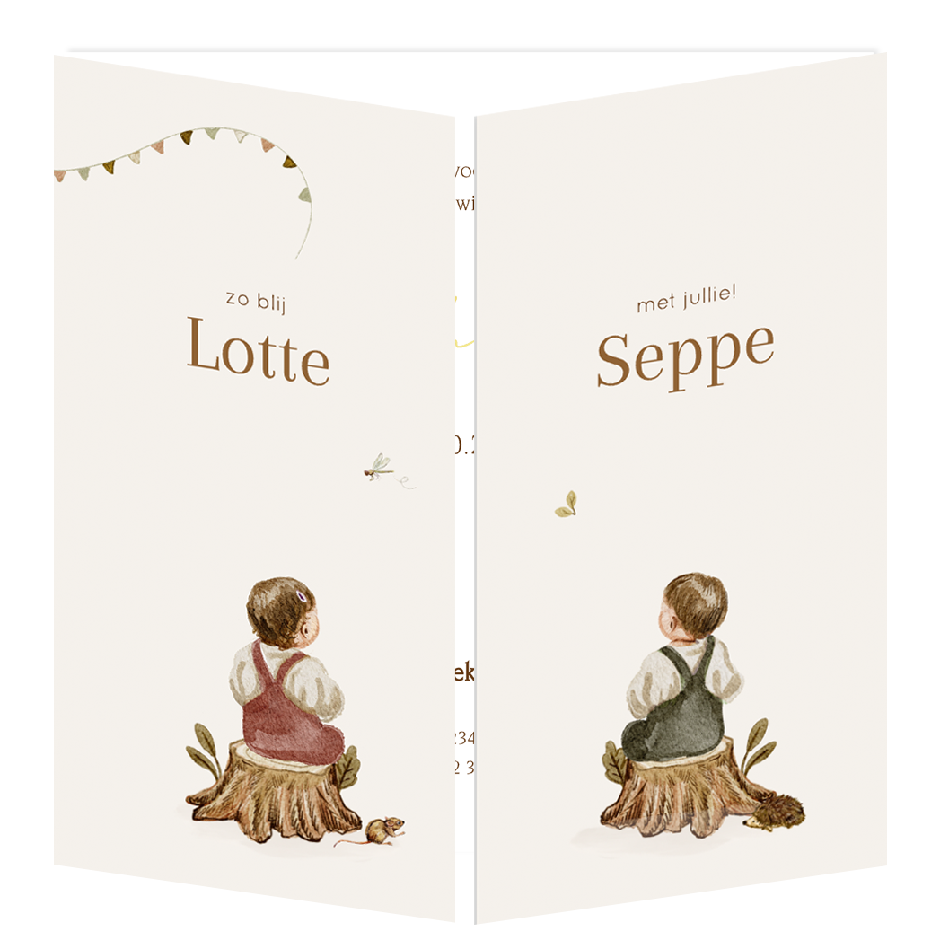 Lief en origineel tweeluik geboortekaartje voor een tweeling. Het kaartje heeft een herfst sfeer met boomstammen en bosdiertjes. Op ieder luikje staat een kindje die op een boomstam zit. Aan de ene kant een jongetje en aan de andere kant een meisje. Dit getekende kaartje kunnen we ook aanpassen voor twee meisjes of twee jongens. Heb je hulp nodig, laat het ons weten!