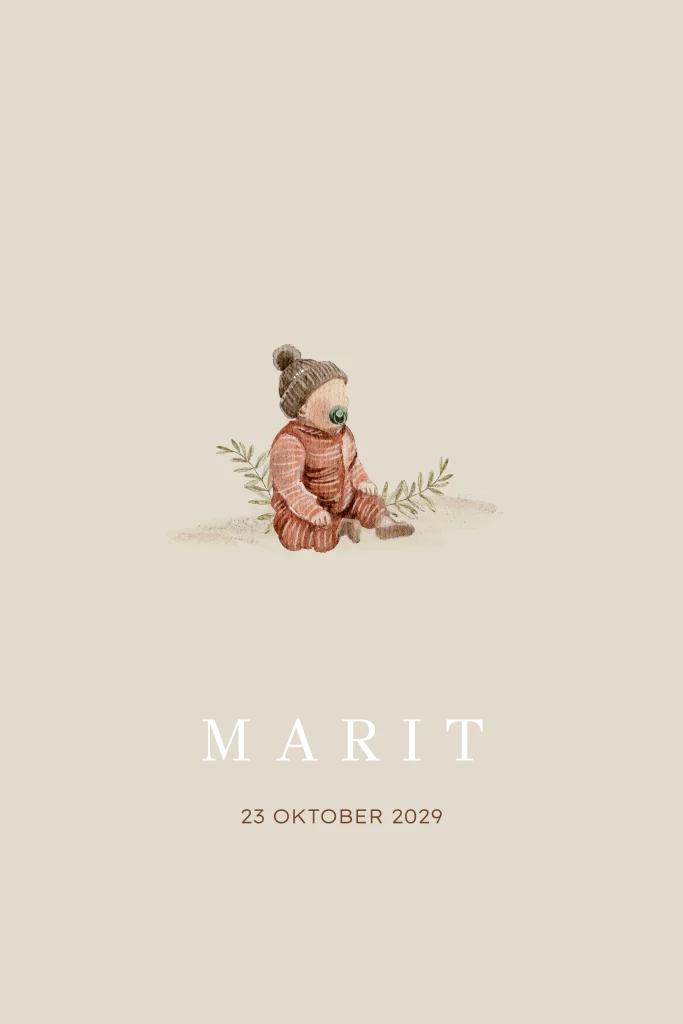 Zo lief dit geboortekaartje voor een meisje in de winter. De baby heeft een muts op en een roze bruin pakje aan. Daarbij zijn wat groene takjes getekend. De naam staat in goudfolie, maar je kunt de folie kleur ook aanpassen.