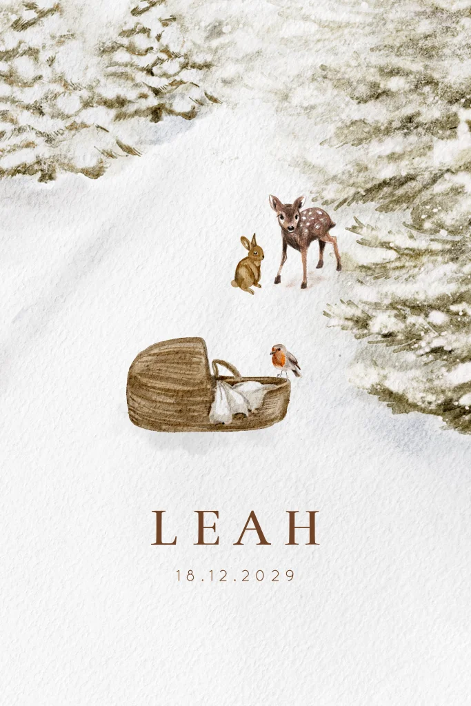 Winter geboortekaartje met bosdieren in sneeuw en babymandje
