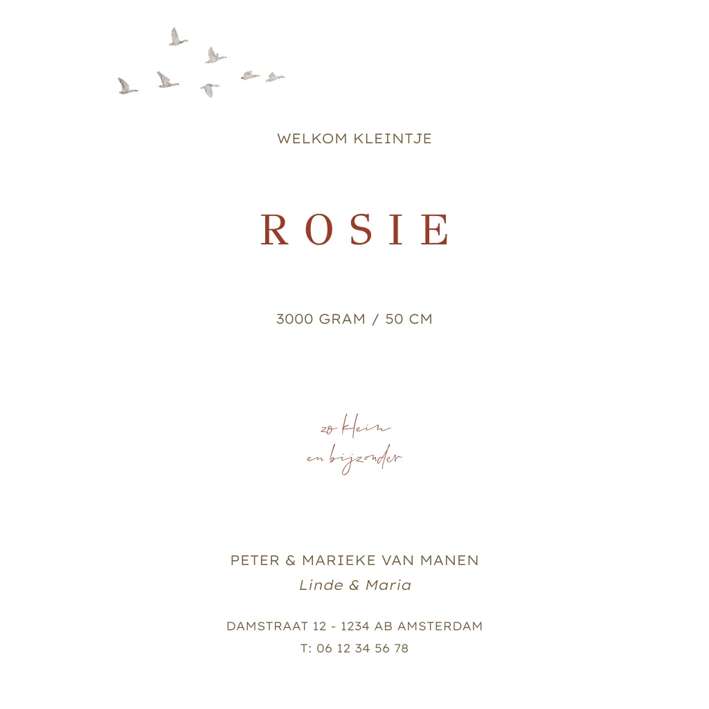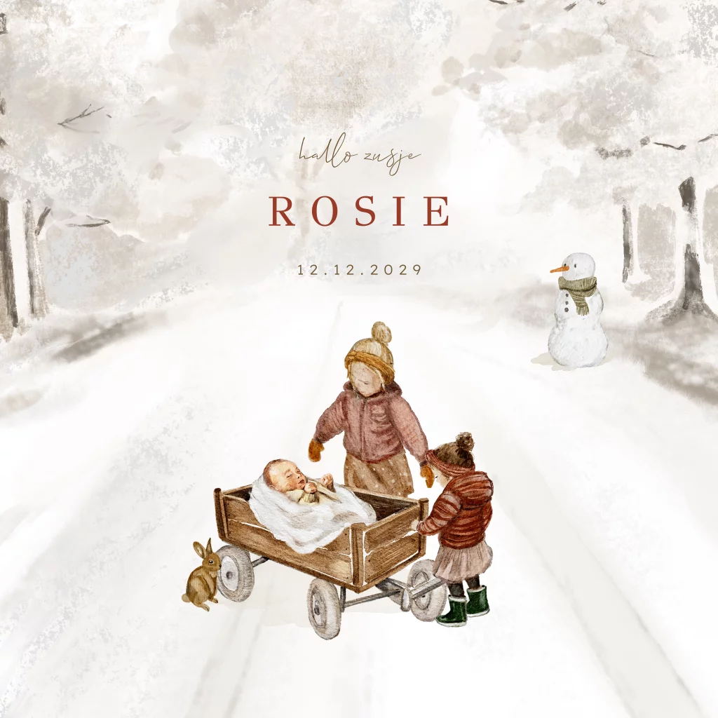 Wat een mooi getekend winter geboortekaartje is dit. De aquarel achtergrond met besneeuwde bomen en op het pad staat een bolderkar met baby en twee zusjes erbij. Je kunt de kindjes op dit kaartje vervangen door andere winter kindjes. Uniek babykaartje voor een baby die in de winter wordt geboren.
