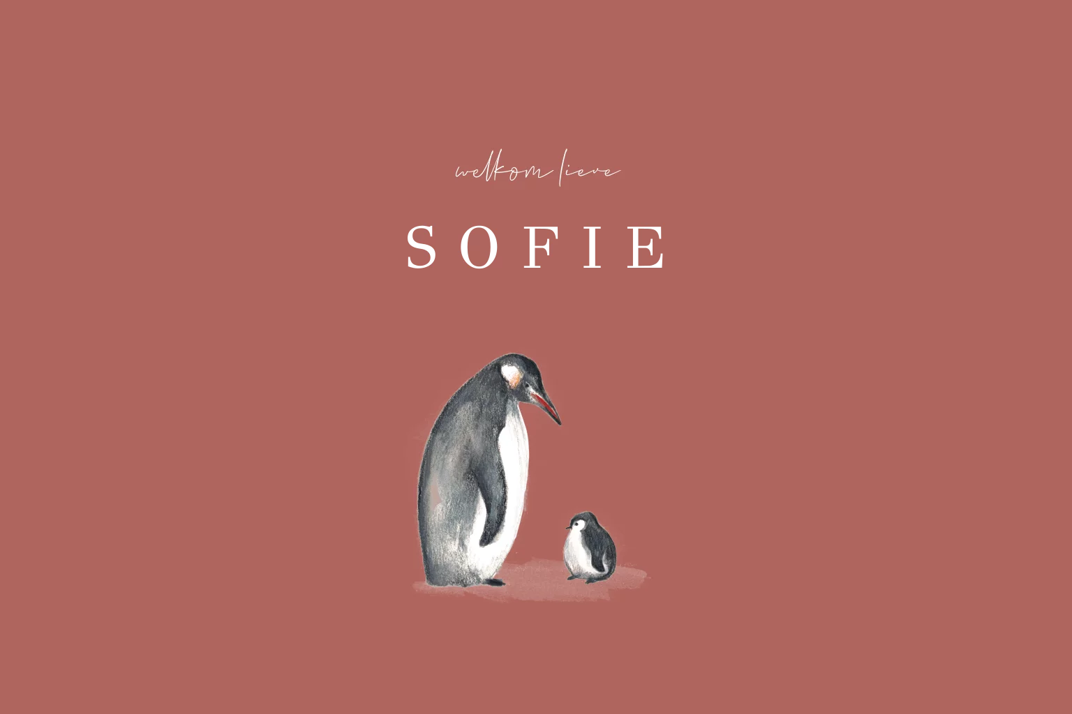 Geboortekaartje winter in roestroze en pinguïn met kleintje