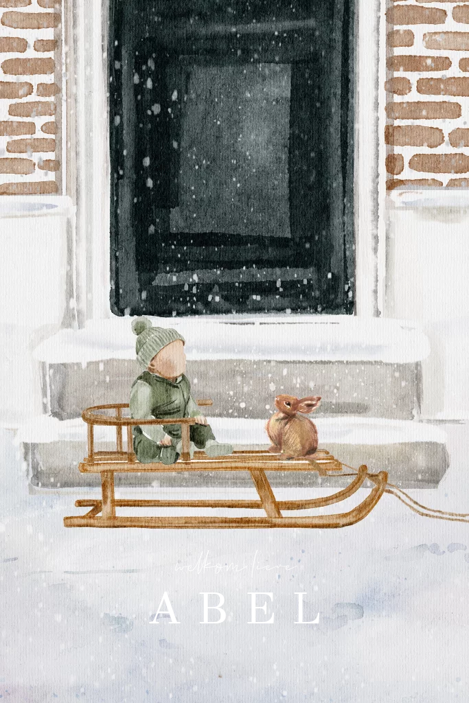 Wat een lief getekend geboortekaartje is dit! De achtergrond is een prachtige aquarel tekening van een voordeur in de sneeuw. Op de slee zit een jongetje en een konijn. Dit unieke winter geboortekaartje heeft een zwartfolie naam en kan je zelf bewerken en aanpassen.