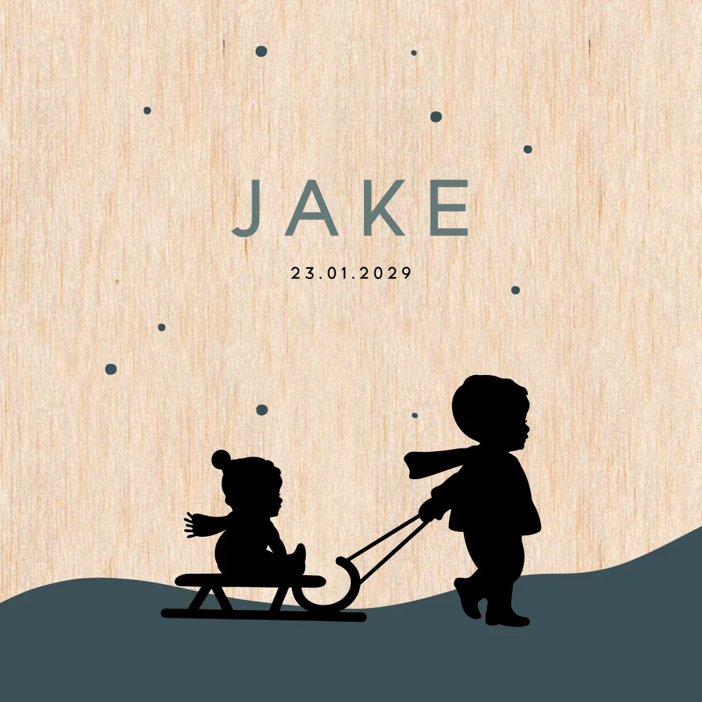 Stoer geboortekaartje van echt hout in een winter thema. Op het kaartje staat een silhouet illustratie van een grote broer die een broertje op een slee trekt. De kleine stipjes rondom maken het kaartje nog wat liever.