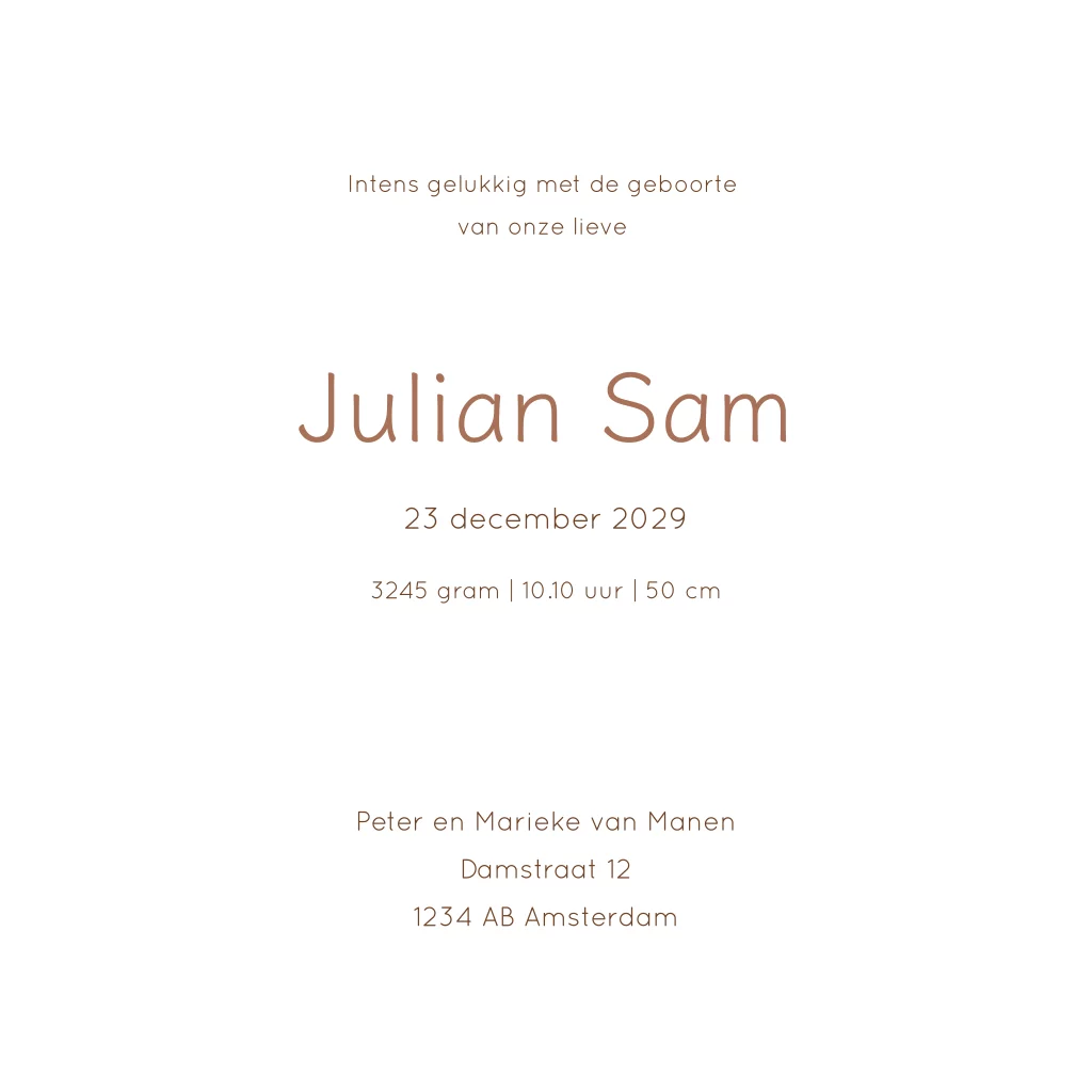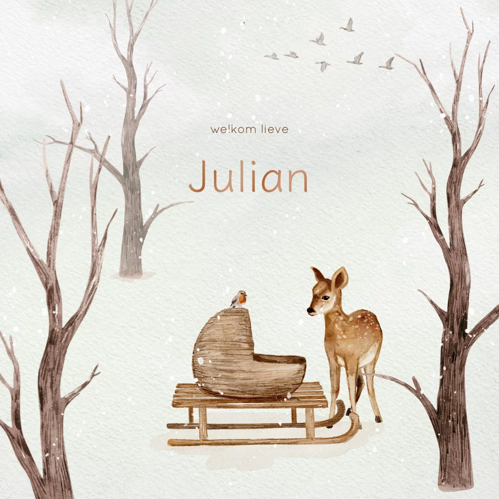 Geboortekaartje met een winter thema. De kale bomen in een sneeuw landschap geven dit kaartje een mooie winter sfeer. Op de slee staat een mandje met een baby en een hertje kijkt in de mand. Leuk unisex geboortekaartje. De naam wordt gedrukt in hoogglans, de kleur kan je zelf aanpassen.