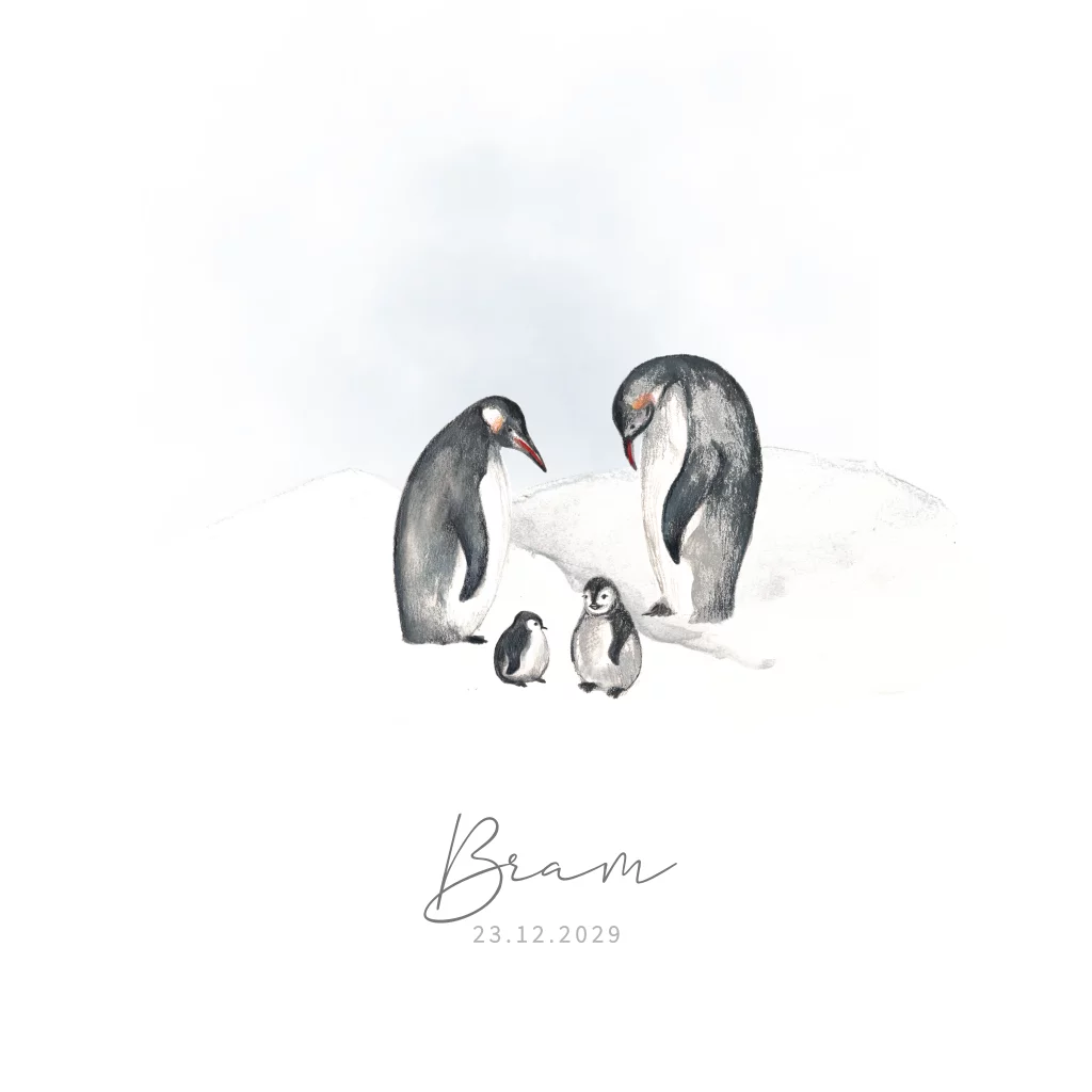 Lief getekend geboortekaartje in een winter thema. De getekende pinguins kijken naar hun kleine kindjes in de sneeuw. De achtergrond heeft lichtblauwe waterverf. Je kunt ook een pinguin verwijderen als het jullie eerste kindje is.