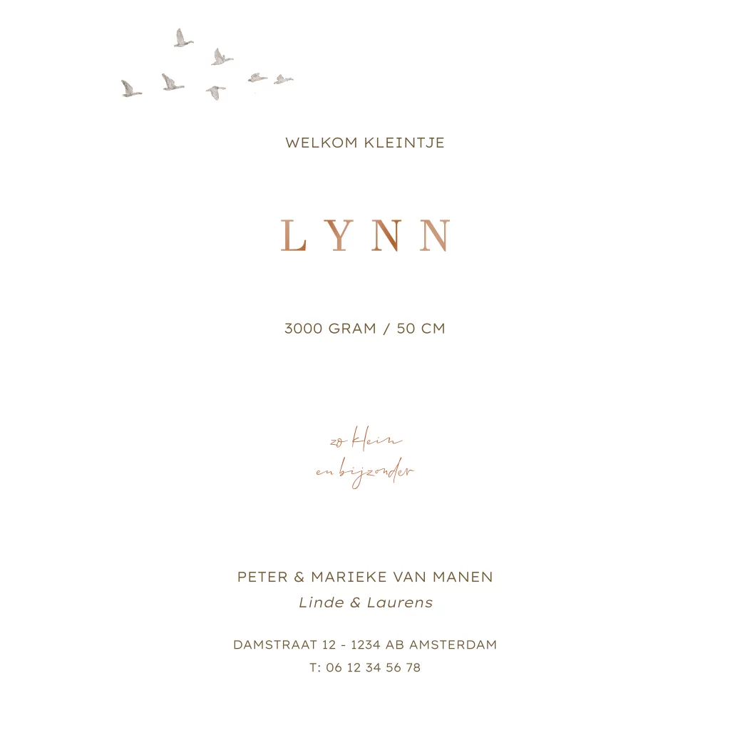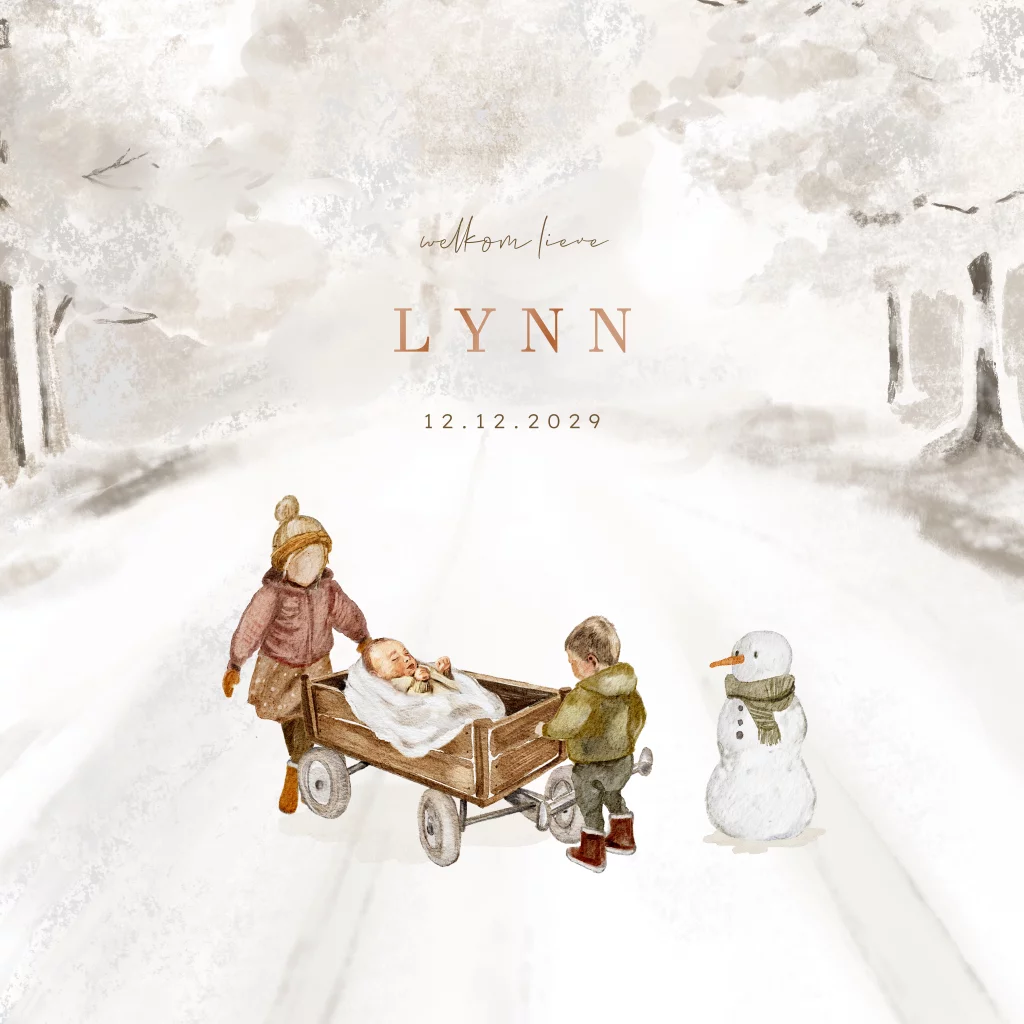 Dit winter geboortekaartje is zo lief. De achtergrond is een bos in de winter met sneeuw. Daarop staat een kar met een baby en daar omheen een grote zus en een broertje. De naam wordt gedrukt in koperfolie. De sneeuwpop maakt het helemaal af. Je kunt de illustraties ook vervangen door andere broertjes en zusjes. De naam wordt gedrukt in hoogglans, deze kleur kan je aanpassen.