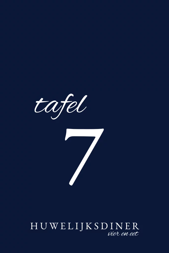 Tafelnummer bruiloft diner donkerblauw Op zoek naar een stijlvol tafelnummer voor het diner van jullie bruiloft? Ons donkerblauwe tafelnummer is de perfecte keuze. Met een klassieke uitstraling en een minimalistisch ontwerp past dit tafelnummer perfect bij een chique en moderne bruiloft. De rustige uitstraling van de donkerblauwe achtergrond zorgt voor een stijlvolle toevoeging aan jullie tafelsetting. Dit tafelnummer is niet alleen simpel en clean, maar ook praktisch in gebruik. Als jullie meerdere tafels hebben, is het eenvoudig om dit tafelnummer op te slaan in jullie account en vervolgens te kopiëren en het getal aan te passen. Op deze manier hebben jullie voor ieder tafelnummer een nieuwe, uniforme kaart met een prachtige typografie.