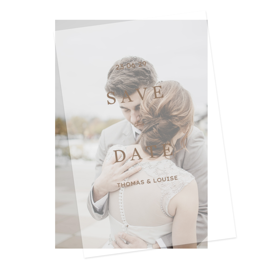 Deze klassieke save the date kaart wordt gedrukt op kalk/calco papier met een doorzichtige uitstraling. De namen en andere teksten worden gedrukt in bruin hoogglans maar kan je ook zelf in kleur aanpassen. Je kunt hierbij ook nog een zelfde formaat kaart bestellen met een foto van jullie. Dit geeft een mooi geheel.