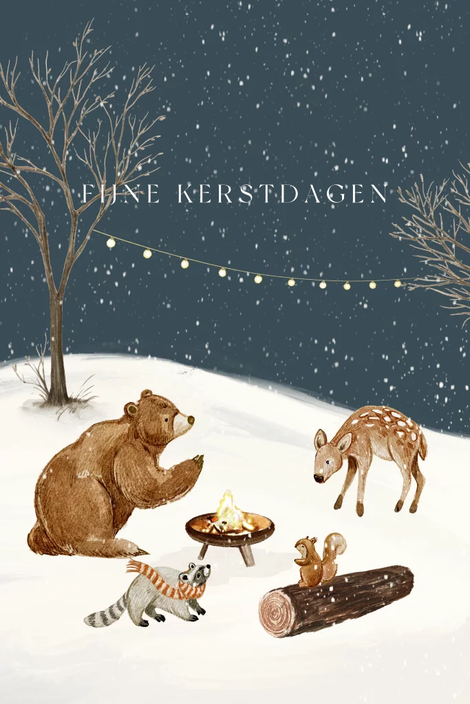 Breng de magie van de winter tot leven met deze sfeervolle kerstkaart! De prachtige illustratie toont een gezellig tafereel van bosdieren die zich rondom een knisperend kampvuur verzamelen, omringd door feestelijke lampjes en met besneeuwde bomen op de achtergrond. De warme gloed van het vuur en de vrolijke lichtjes stralen een uitnodigende sfeer uit, perfect om de kerstboodschap over te brengen. Deze kaart is ideaal om dierbaren te verrassen en warmte te verspreiden tijdens de feestdagen. De tekst wordt gedrukt in glanzend goudfolie wat de kaart extra mooi maakt. Schrijf achterop eigen teksten en verstuur je kaarten.