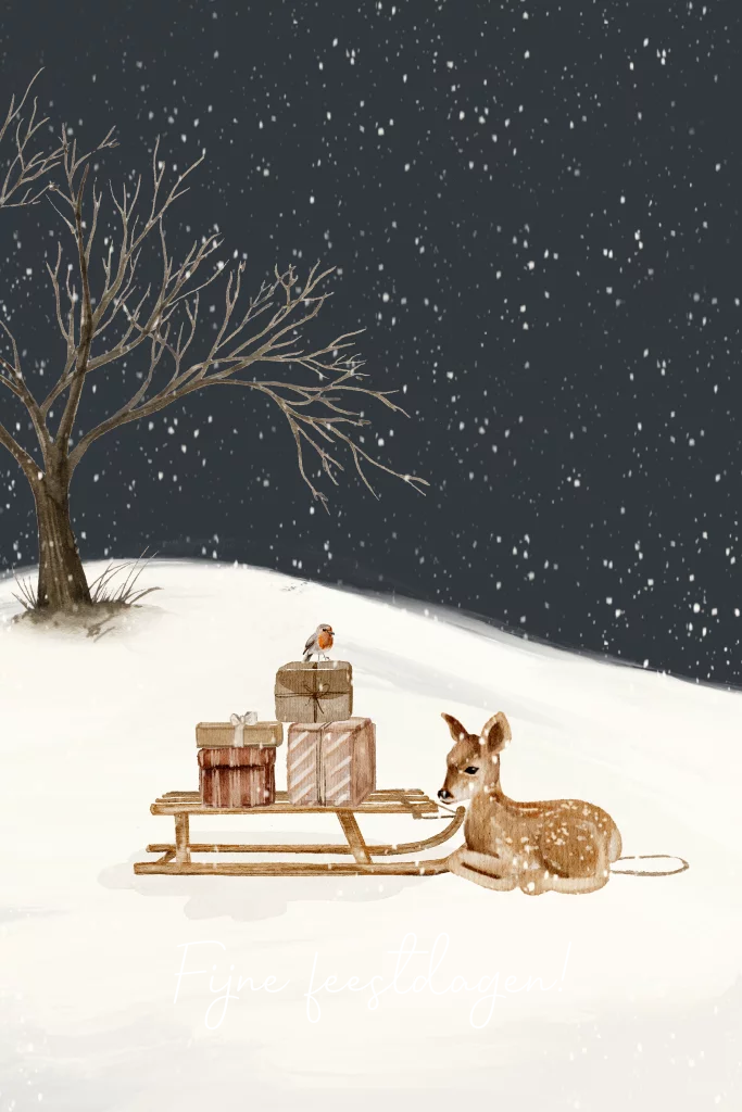 Een gezellig winterplaatje heeft deze kerstkaart. In de sneeuw ligt een hertje bij een slee met cadeautjes. De achtergrond is donkerblauw, maar kan je ook in een andere kleur maken. De tekst wordt gedrukt in goudfolie, wat de kaart een extra mooie en feestelijke uitstraling geeft.
