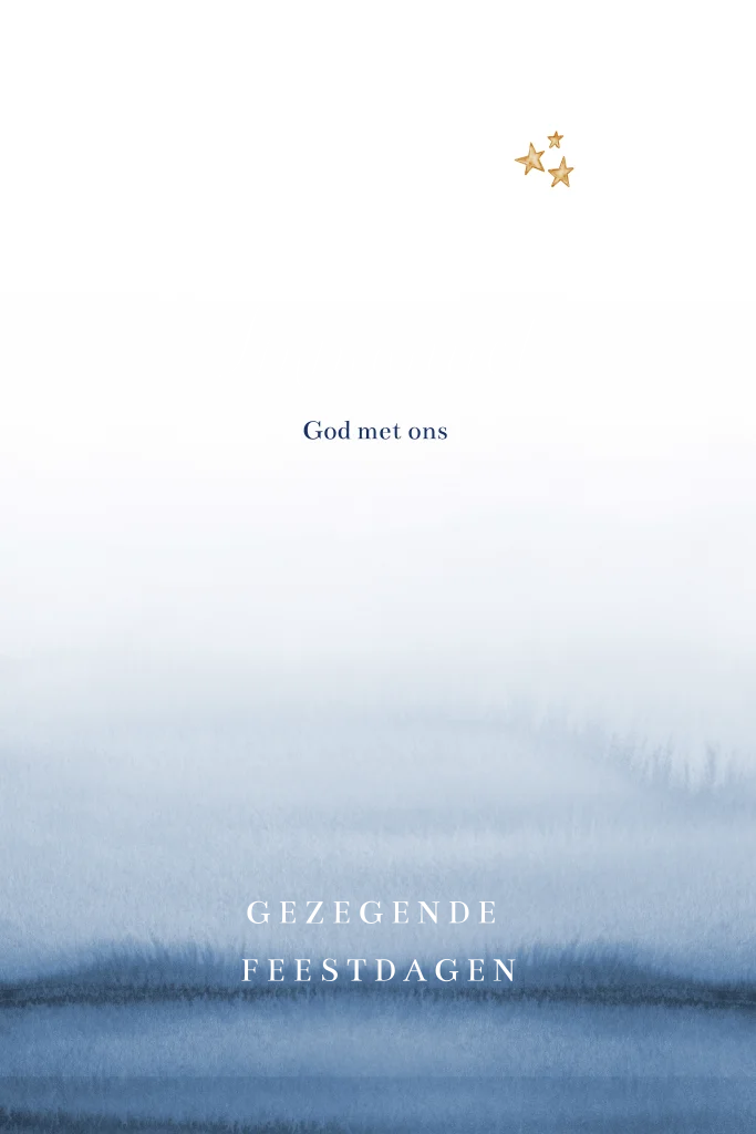 Mooie christelijke kerstkaart met onderaan blauwe waterverf. Op de kaart staat Immanuel in goudfolie gedrukt voor een extra stijlvolle kaart. Je kunt alles op deze kaart eenvoudig zelf aanpassen en bewerken.
