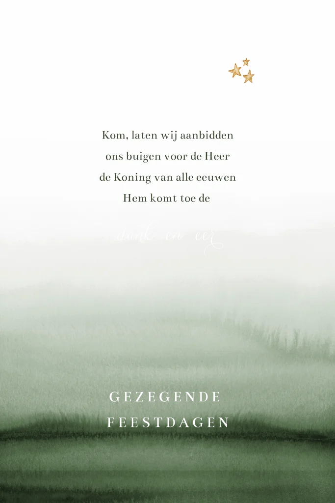 Mooie christelijke kerstkaart met onderaan groene waterverf. Op de kaart staat een kerstlied en kleine sterren. De teksten worden gedrukt in goudfolie. Je kunt alles op deze kaart eenvoudig zelf aanpassen en bewerken.