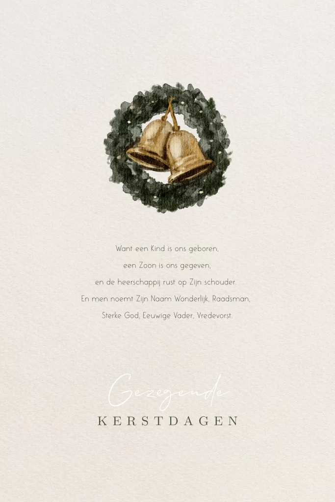 Christelijke kerstkaart met een Bijbeltekst en een illustratie van een kerstkrans met klokken. Onderaan de kerstwens die in goudfolie wordt gedrukt.
