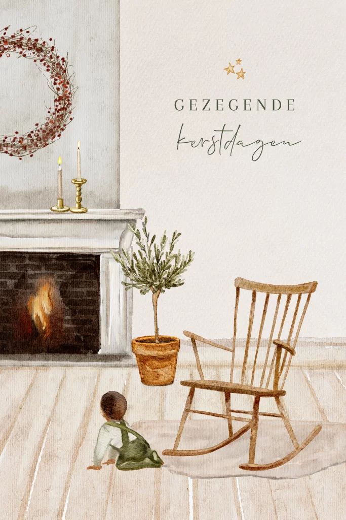 Unieke christelijke kerstkaart met illustratie van een open haard met kaarsen en daarnaast een olijfboompje. Bij de haard staat een schommelstoel op een kleedje. Op de grond kruipt een baby. Heb je meer kinderen, zoek dan in onze afbeeldingen map andere kindjes die je toevoegt aan de kaart. Deze kerstkaart kan je zelf helemaal aanpassen.