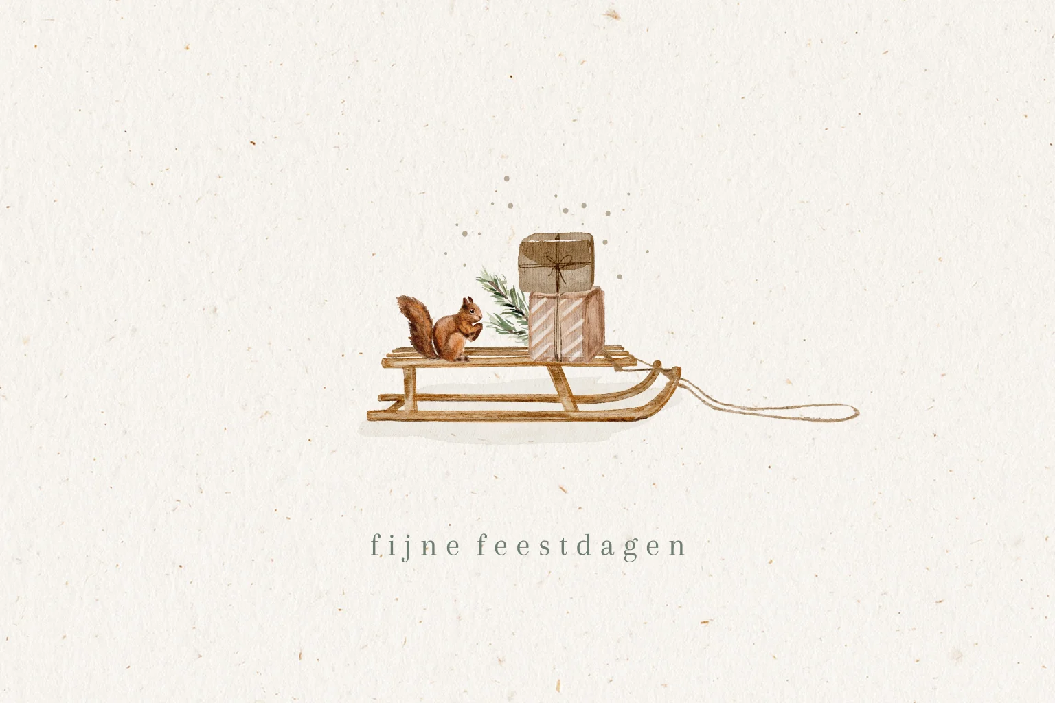 Unieke getekende kerstkaart met een sfeervolle illustratie van een slee met cadeautjes. Daarnaast zit een eekhoorn. De groene kerstboom takjes maken het plaatje compleet. Onze kerstkaarten zijn uniek en kan je zelf helemaal bewerken en personaliseren.