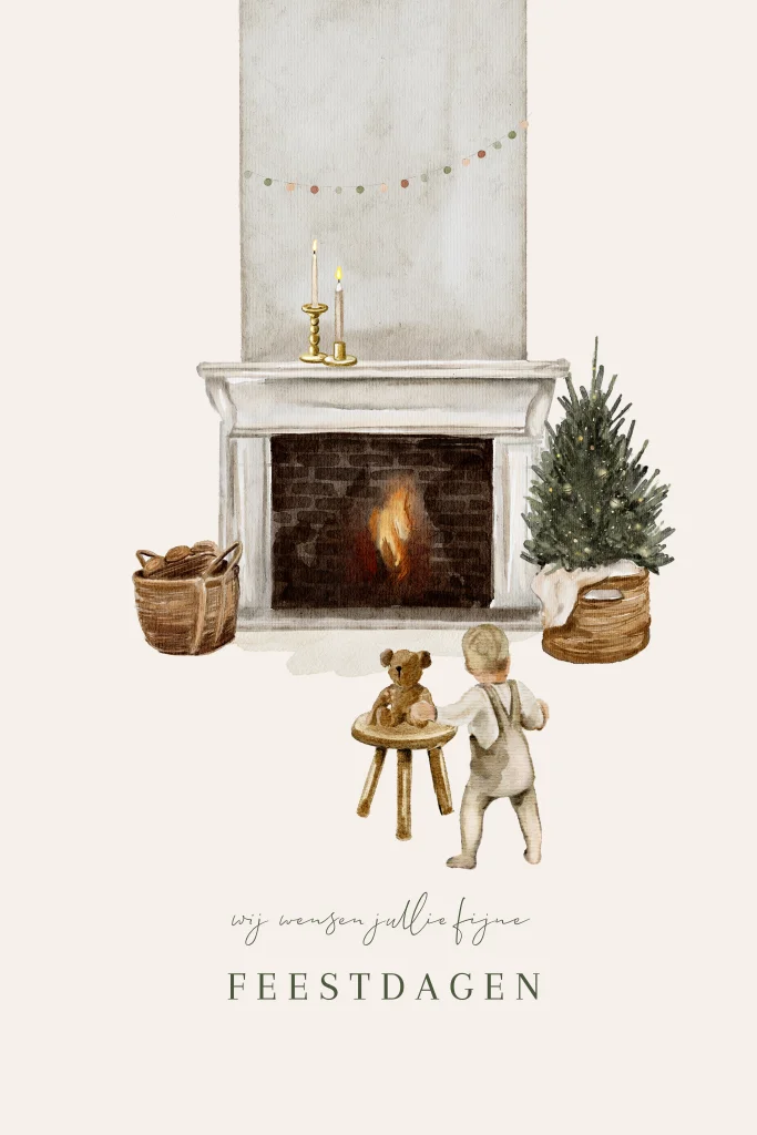 Prachtige getekende kerstkaart met een open haard en een kerstboom. Bij de haard staat een jongetje bij een krukje met beer. Leuke kaart als jullie al een zoontje hebben.Je kunt hem ook aanpassen met meerdere kindjes.