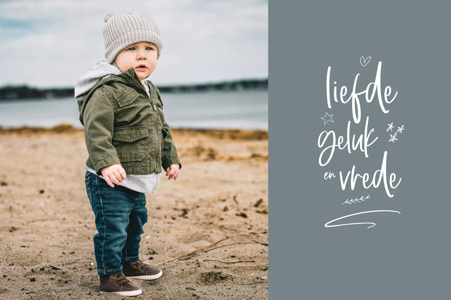 Enkele kerstkaart met een blauwe achtergrond. De tekst op de kaart is een handgeschreven tekst met liefde, geluk en vrede. Vervang de foto door een eigenn foto van jullie kindje of gezin. Maak de achtergond van deze kerstkaart passend bij jullie foto. Heb je hulp nodig, laat even weten!