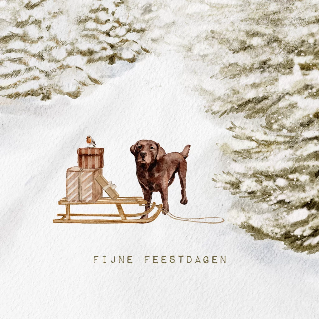Getekende kerstkaart met een aquarel achtergrond van een sneeuw landschap. Daarop staat een slee met cadeaus en een bruine labrador. Unieke getekende kerstkaart die je zelf helemaal kunt bewerken en aanpassen.