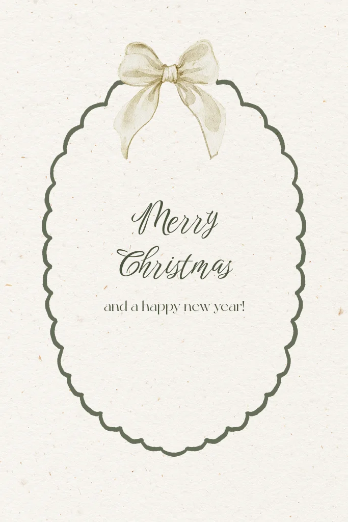 Kerstkaart met een achtergrond van beige papier en daarop een groene border met getekende strik. Je kunt de illustraties en teksten zelf aanpassen in onze editor.