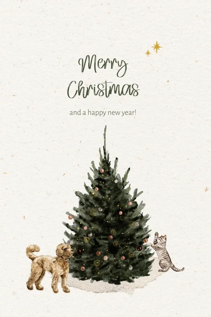 Kerstkaart met een achtergrond van beige papier en daarop een kerstboom met lampjes en kerstballen. Daarbij een hond, een labradoodle, en een kat die de ballen uit de boom haalt. Je kunt de illustraties en teksten zelf aanpassen in onze editor. Dus de hond of kat kan ook verwijderd worden of kies een ander huisdier uit onze beeldbank.
